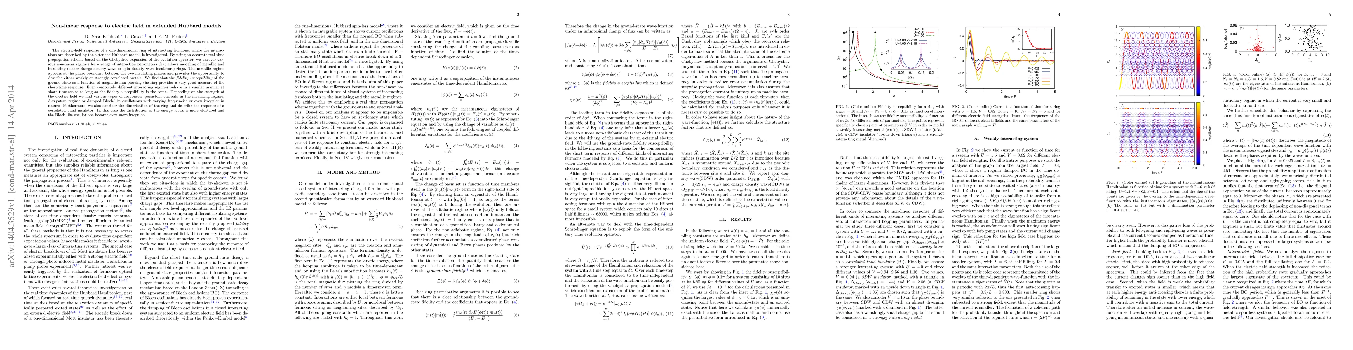 This paper investigates the non-linear electric-field response in a one-dimensional ring of interacting fermions described by the extended Hubbard model, revealing various regimes including metallic, charge-density wave, and spin-density wave insulators. The fidelity susceptibility of the ground state is identified as a key measure of the short-time response, leading to diverse behaviors such as persistent currents, dissipative regimes, and irregular oscillations depending on the electric field strength.