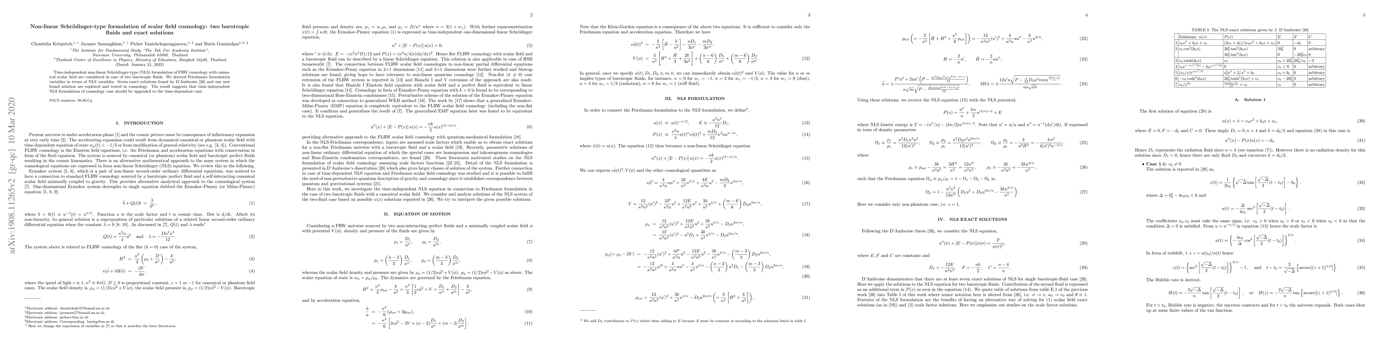 Time-independent non-linear Schr\"{o}dinger-type (NLS) formulation of FRW cosmology with canonical scalar field are considered in case of two barotropic fluids. We derived Friedmann formulation variables in terms of NLS variables. Seven exact solutions found by D'Ambroise \cite{DAmbroise:2010dgl} and one new found solution are explored and tested in cosmology. The result suggests that time-independent NLS formulation of cosmology case should be upgraded to the time-dependent case.