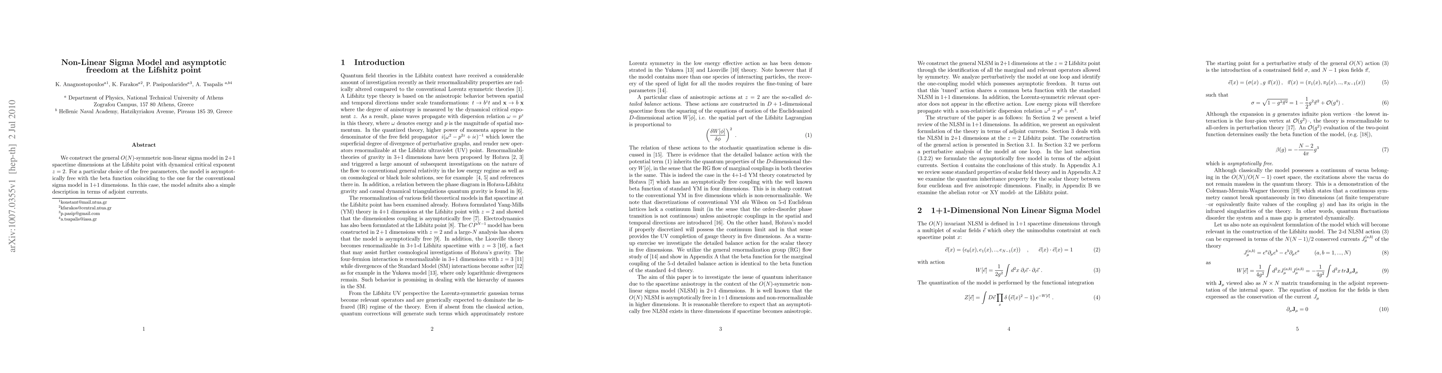 This research constructs a 2+1D O(N)-symmetric non-linear sigma model at the Lifshitz point with z=2, demonstrating asymptotic freedom with a beta function matching that of a 1+1D conventional sigma model. The model can be described using adjoint currents for specific parameter choices.