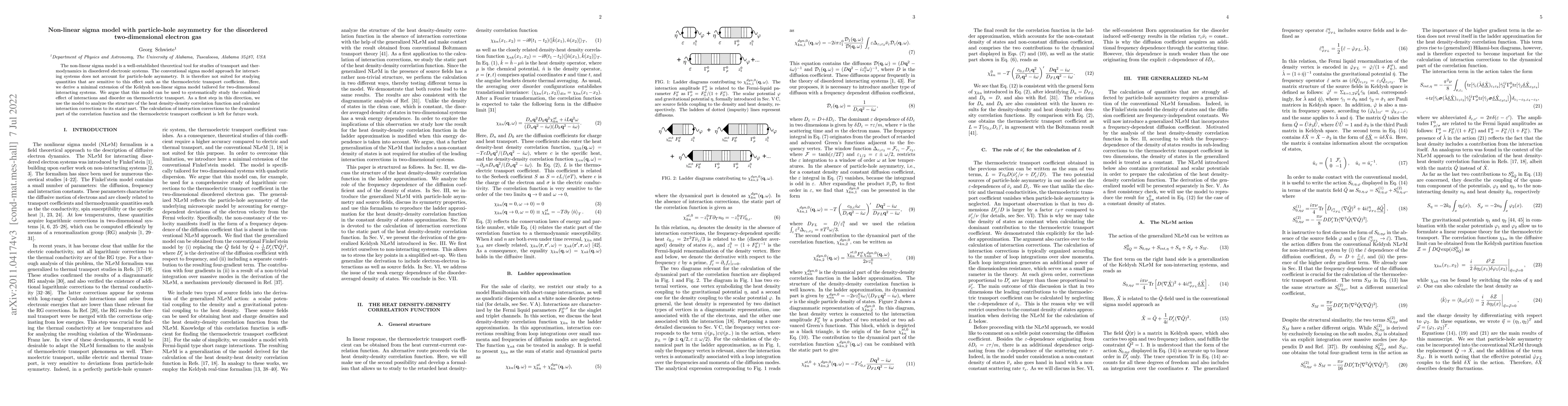 This paper extends the Keldysh non-linear sigma model to incorporate particle-hole asymmetry, enabling studies of thermoelectric transport in disordered two-dimensional electron gases. The authors analyze the heat density-density correlation function and calculate static interaction corrections, with future work planned to address dynamic parts and transport coefficients.