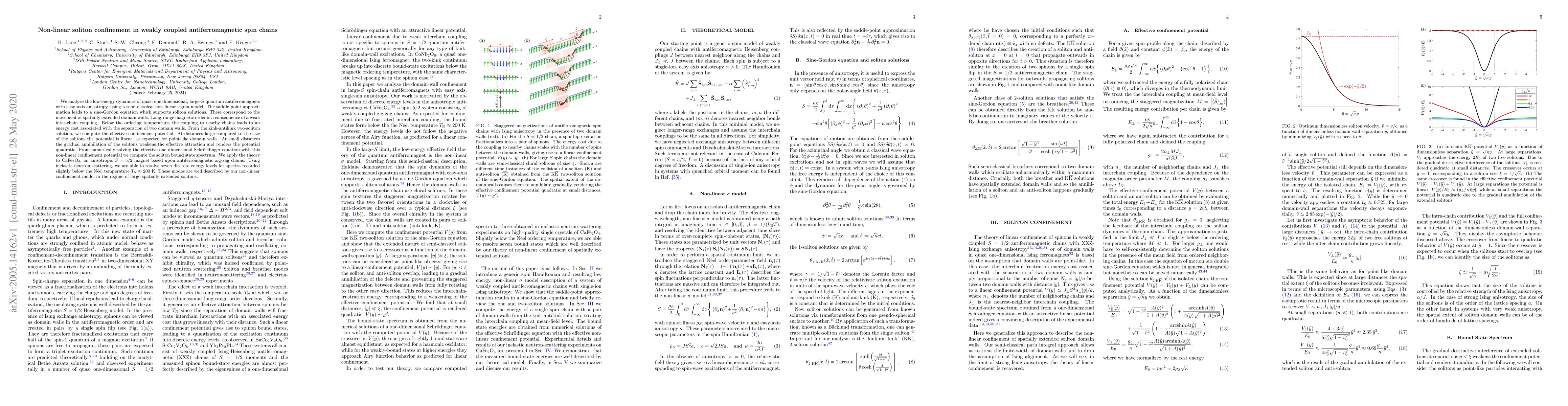 Researchers studied soliton confinement in weakly coupled antiferromagnetic spin chains, finding a linear confinement potential at large distances that becomes quadratic at small distances, and applied this model to the magnet CaFe2O4.