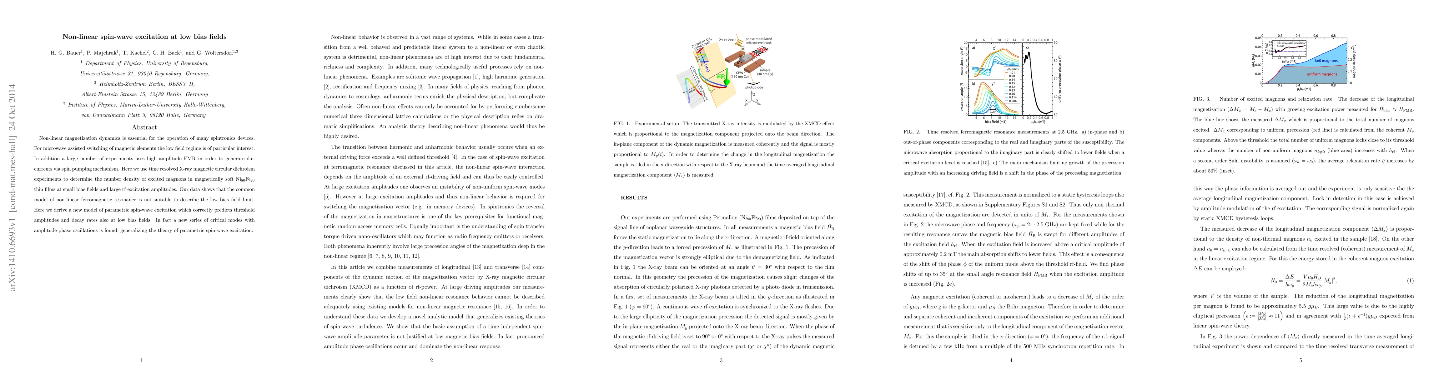Non-linear magnetization dynamics is essential for the operation of many spintronics devices. For microwave assisted switching of magnetic elements the low field regime is of particular interest. In addition a large number of experiments uses high amplitude FMR in order to generate d.c. currents via spin pumping mechanism. Here we use time resolved X-ray magnetic circular dichroism experiments to determine the number density of excited magnons in magnetically soft Ni_80Fe_20 thin films at small bias fields and large rf-excitation amplitudes. Our data shows that the common model of non-linear ferromagnetic resonance is not suitable to describe the low bias field limit. Here we derive a new model of parametric spin-wave excitation which correctly predicts threshold amplitudes and decay rates also at low bias fields. In fact a new series of critical modes with amplitude phase oscillations is found, generalizing the theory of parametric spin-wave excitation.