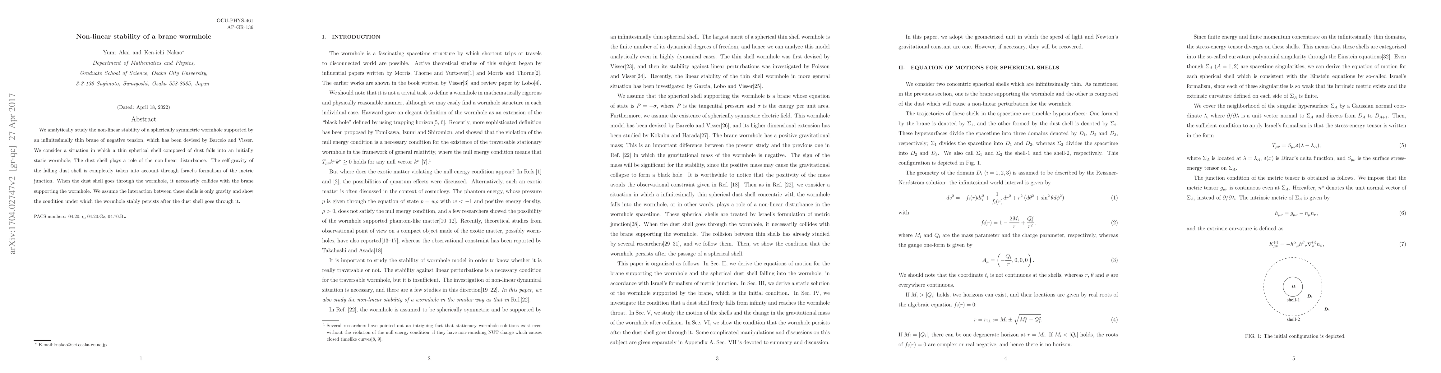 The research analytically studies the non-linear stability of a spherically symmetric wormhole supported by an infinitesimally thin brane of negative tension, considering a dust shell falling into the wormhole as a non-linear disturbance. The self-gravity of the falling dust shell is accounted for using Israel's formalism of the metric junction.