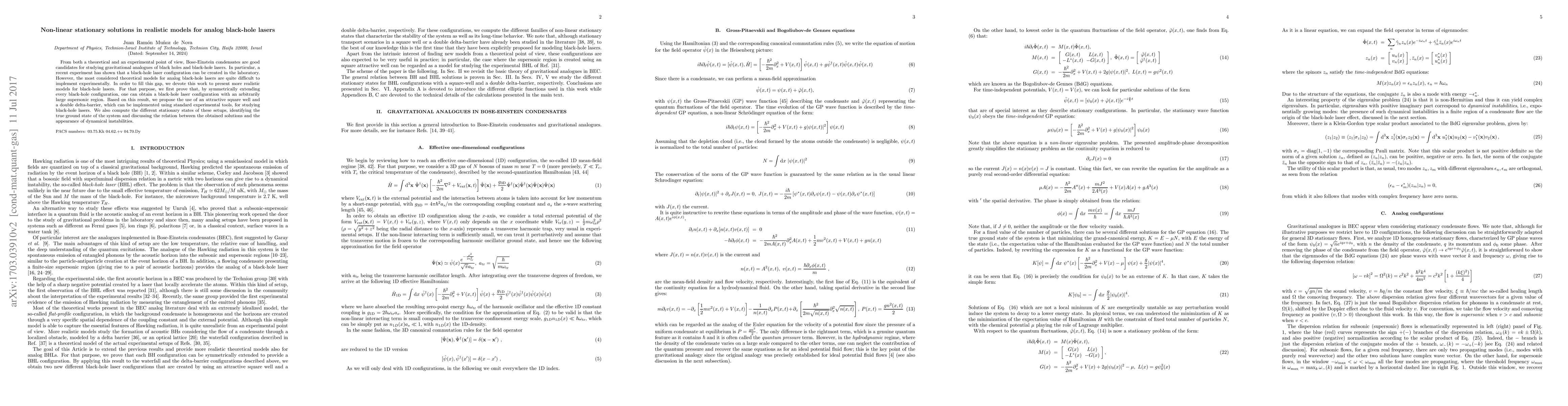 This paper presents realistic models for analog black-hole lasers using Bose-Einstein condensates, proposing an attractive square well and a double delta-barrier for experimental implementation. It also identifies the true ground state and discusses the dynamical instabilities associated with these configurations.