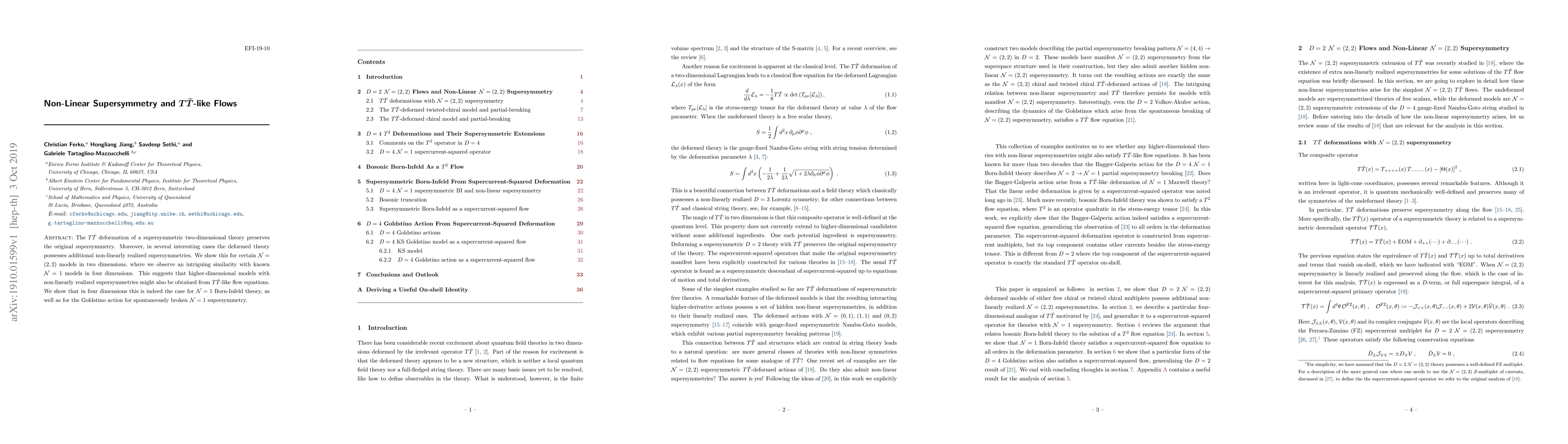 This paper explores how $T\bar{T}$ deformations in two-dimensional supersymmetric theories can preserve original supersymmetry while introducing additional non-linearly realized supersymmetries, demonstrating this for $\mathcal N=(2,2)$ models and drawing parallels to $\mathcal N=1$ models in four dimensions. It concludes that similar non-linearly realized supersymmetries in higher dimensions can also arise from $T\bar{T}$-like flows, exemplified by $\mathcal N=1$ Born-Infeld theory and the Goldstino action.