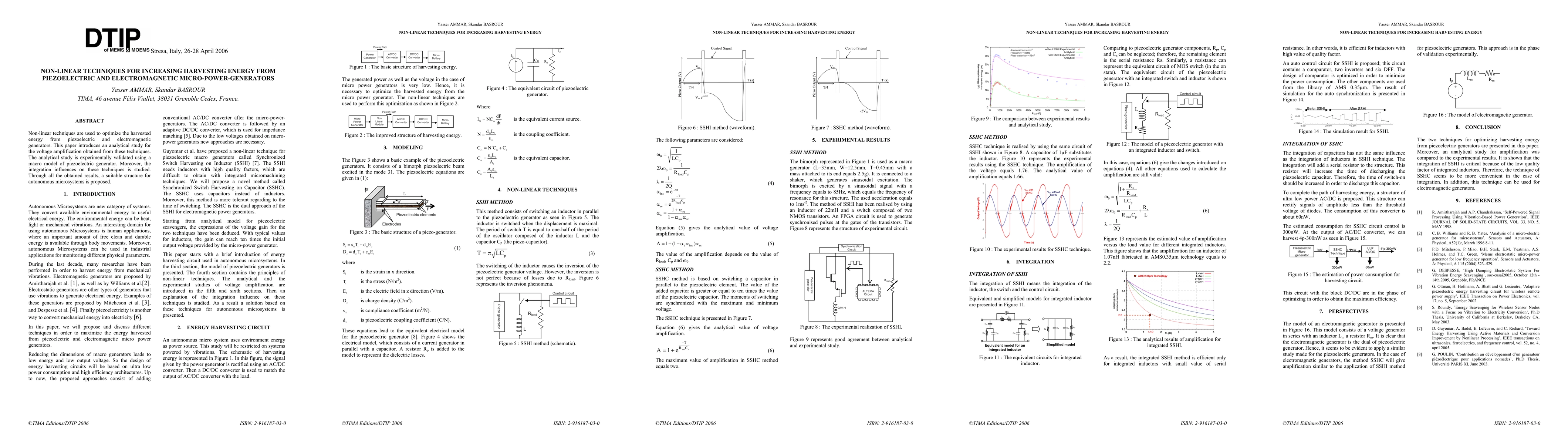 This paper introduces an analytical study for optimizing energy harvesting from piezoelectric and electromagnetic generators using non-linear techniques, proposing a suitable structure for autonomous microsystems.