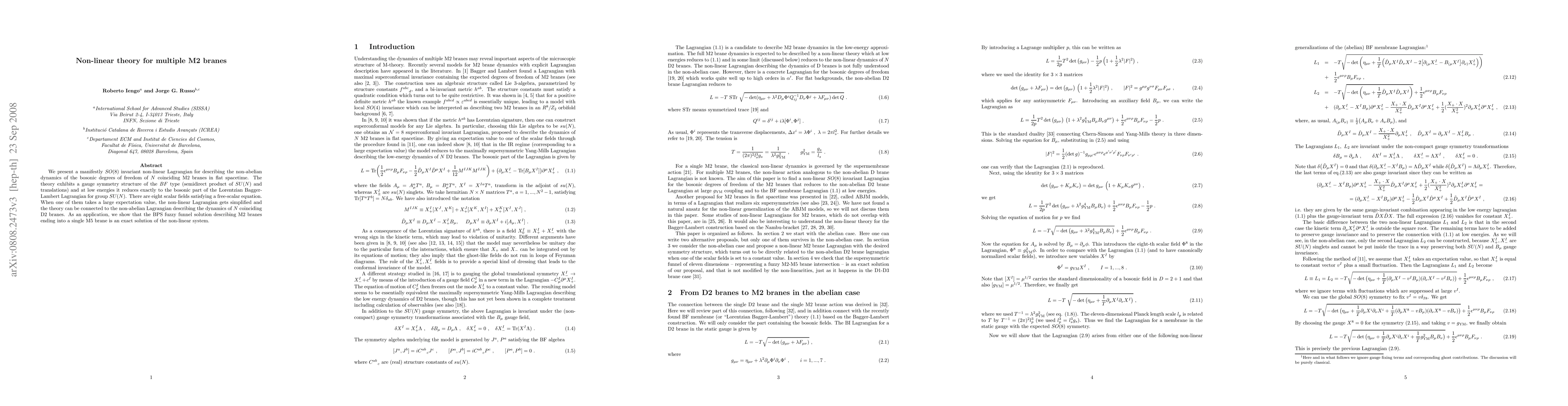 We present a manifestly SO(8) invariant non-linear Lagrangian for describing the non-abelian dynamics of the bosonic degrees of freedom of N coinciding M2 branes in flat spacetime. The theory exhibits a gauge symmetry structure of the BF type (semidirect product of SU(N) and translations) and at low energies it reduces exactly to the bosonic part of the Lorentzian Bagger-Lambert Lagrangian for group SU(N). There are eight scalar fields satisfying a free-scalar equation. When one of them takes a large expectation value, the non-linear Lagrangian gets simplified and the theory can be connected to the non-abelian Lagrangian describing the dynamics of N coinciding D2 branes. As an application, we show that the BPS fuzzy funnel solution describing M2 branes ending into a single M5 brane is an exact solution of the non-linear system.
