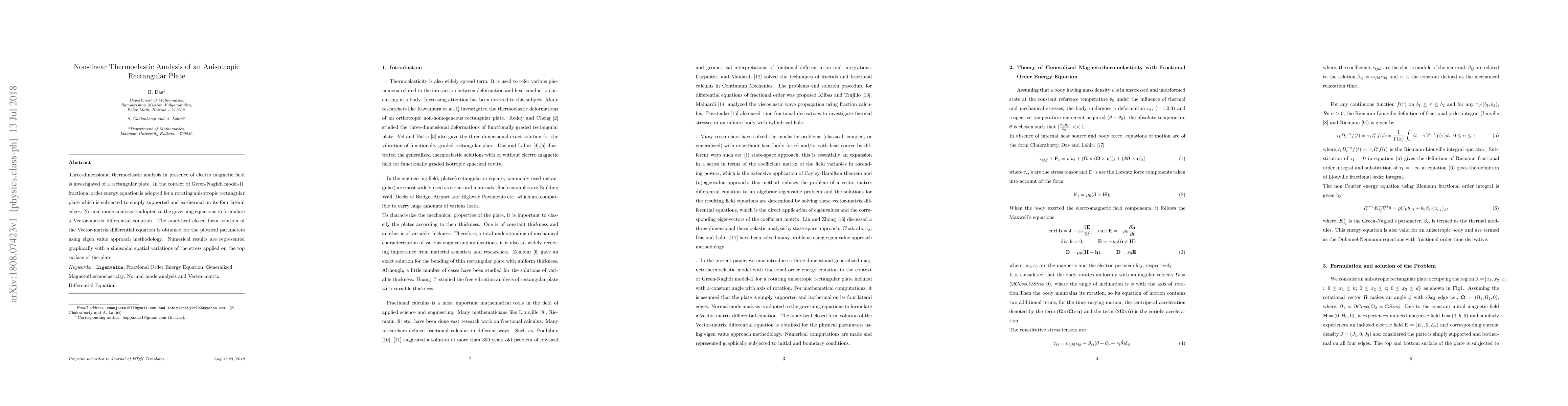 Three-dimensional thermoelastic analysis in presence of electro magnetic field is investigated of a rectangular plate. In the context of Green-Naghdi model-II, fractional order energy equation is adopted for a rotating anisotropic rectangular plate which is subjected to simply supported and isothermal on its four lateral edges. Normal mode analysis is adopted to the governing equations to formulate a Vector-matrix differential equation. The analytical closed form solution of the Vector-matrix differential equation is obtained for the physical parameters using eigen value approach methodology. Numerical results are represented graphically with a sinusoidal spatial variations of the stress applied on the top surface of the plate.