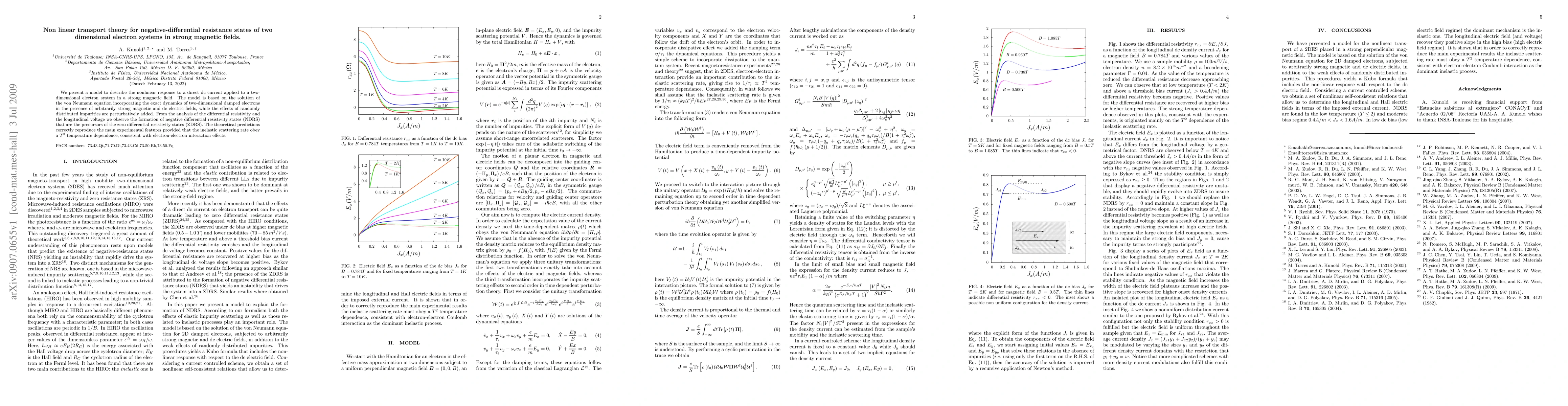 We present a model to describe the nonlinear response to a direct dc current applied to a two-dimensional electron system in a strong magnetic field. The model is based on the solution of the von Neumann equation incorporating the exact dynamics of two-dimensional damped electrons in the presence of arbitrarily strong magnetic and dc electric fields, while the effects of randomly distributed impurities are perturbatively added. From the analysis of the differential resistivity and the longitudinal voltage we observe the formation of negative differential resistivity states (NDRS) that are the precursors of the zero differential resistivity states (ZDRS). The theoretical predictions correctly reproduce the main experimental features provided that the inelastic scattering rate obey a $T^2$ temperature dependence, consistent with electron-electron interaction effects.