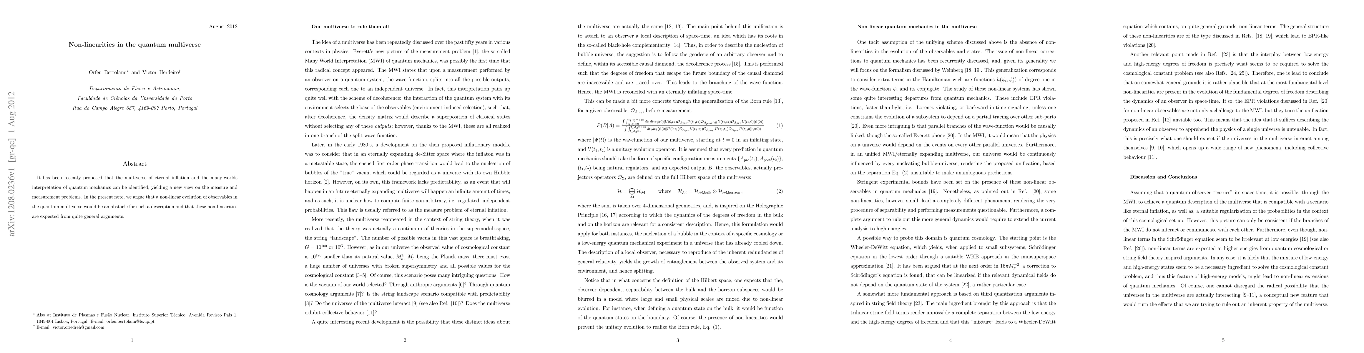 The paper discusses non-linearities in the quantum multiverse, focusing on arguments against non-linear evolution of observables and states, and exploring generalizations of quantum mechanics including non-linear corrections to the Hamiltonian.