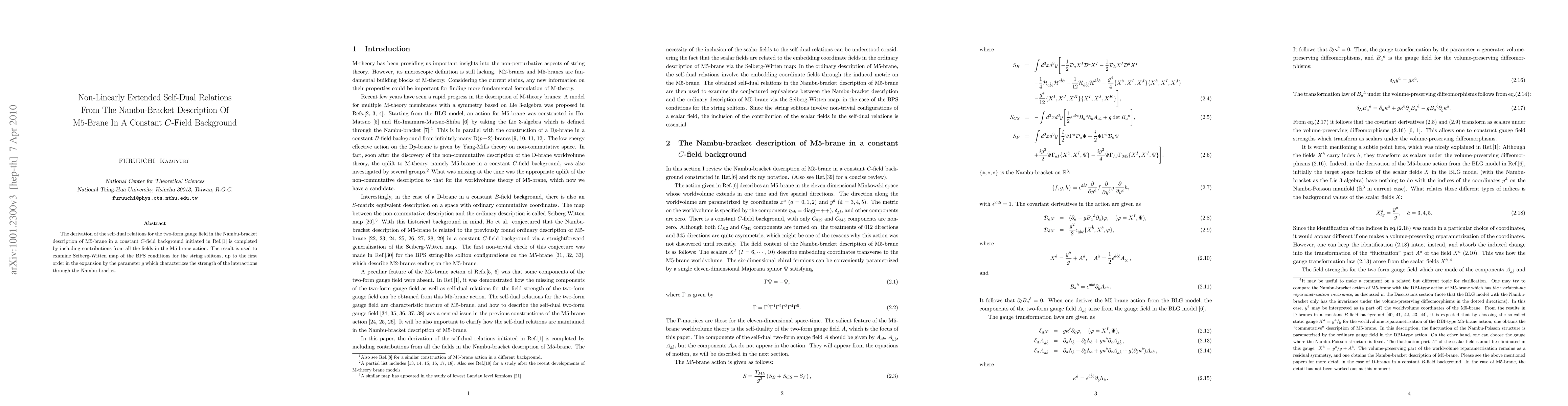 This paper completes the derivation of self-dual relations for the two-form gauge field in the Nambu-bracket description of M5-brane in a constant C-field background, incorporating contributions from all fields in the M5-brane action. The findings are applied to examine the Seiberg-Witten map for BPS conditions of string solitons, up to the first order in the expansion parameter $g$.