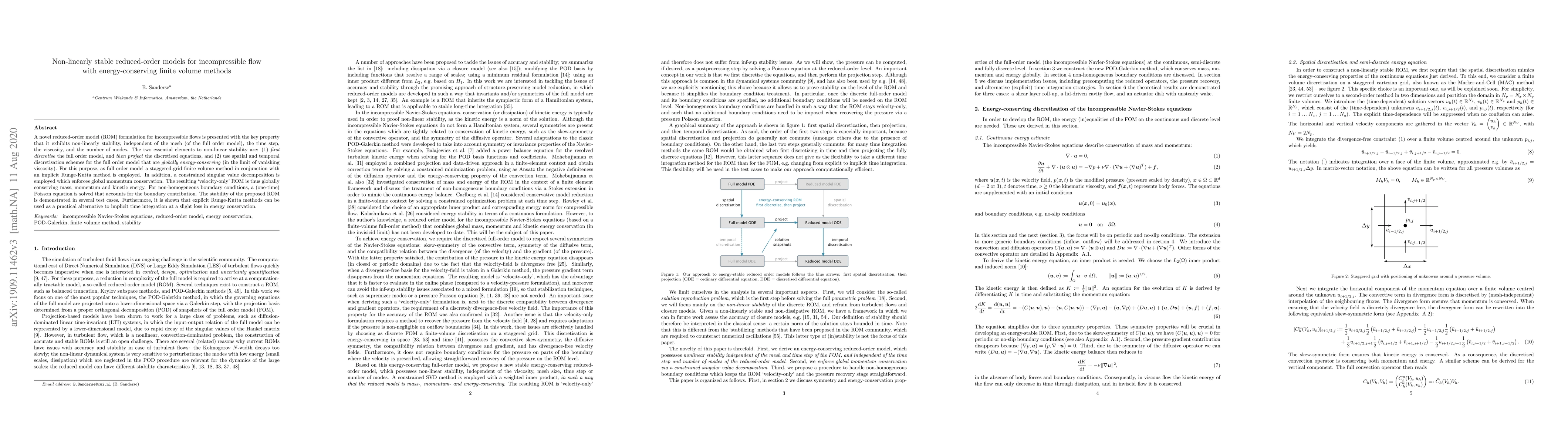 A novel reduced-order model (ROM) formulation for incompressible flows is presented with the key property that it exhibits non-linearly stability, independent of the mesh (of the full order model), the time step, the viscosity, and the number of modes. The two essential elements to non-linear stability are: (1) first discretise the full order model, and then project the discretised equations, and (2) use spatial and temporal discretisation schemes for the full order model that are globally energy-conserving (in the limit of vanishing viscosity). For this purpose, as full order model a staggered-grid finite volume method in conjunction with an implicit Runge-Kutta method is employed. In addition, a constrained singular value decomposition is employed which enforces global momentum conservation. The resulting `velocity-only' ROM is thus globally conserving mass, momentum and kinetic energy. For non-homogeneous boundary conditions, a (one-time) Poisson equation is solved that accounts for the boundary contribution. The stability of the proposed ROM is demonstrated in several test cases. Furthermore, it is shown that explicit Runge-Kutta methods can be used as a practical alternative to implicit time integration at a slight loss in energy conservation.