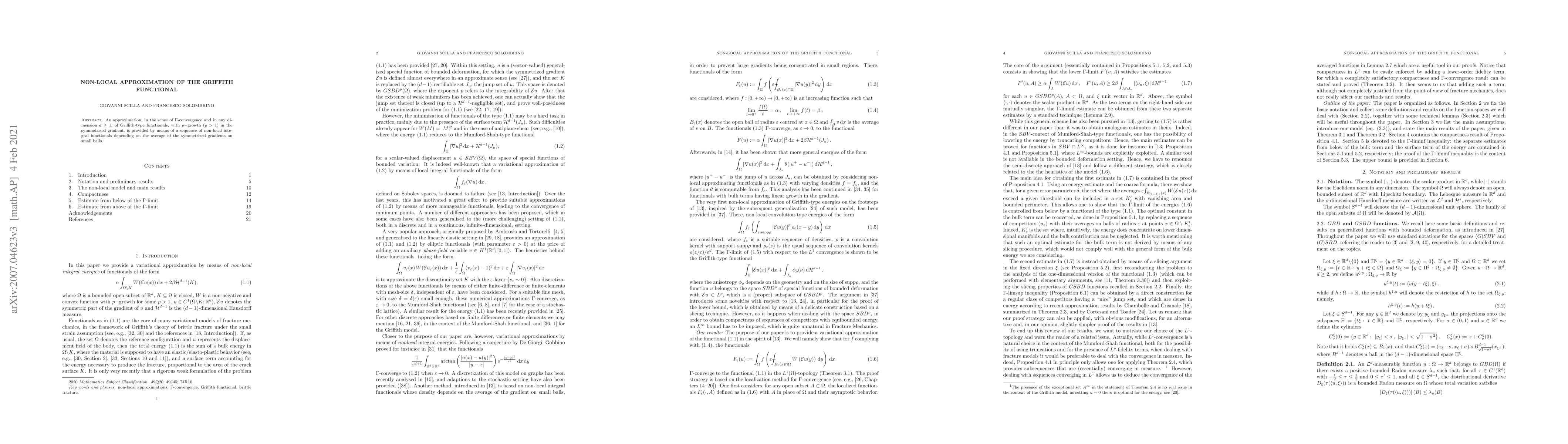 Researchers develop a non-local approximation method for Griffith-type functionals with p-growth in symmetrized gradients, providing a way to model complex physical phenomena. The new approach involves integrating the symmetrized gradients on small balls to create a sequence of non-local integral functionals.