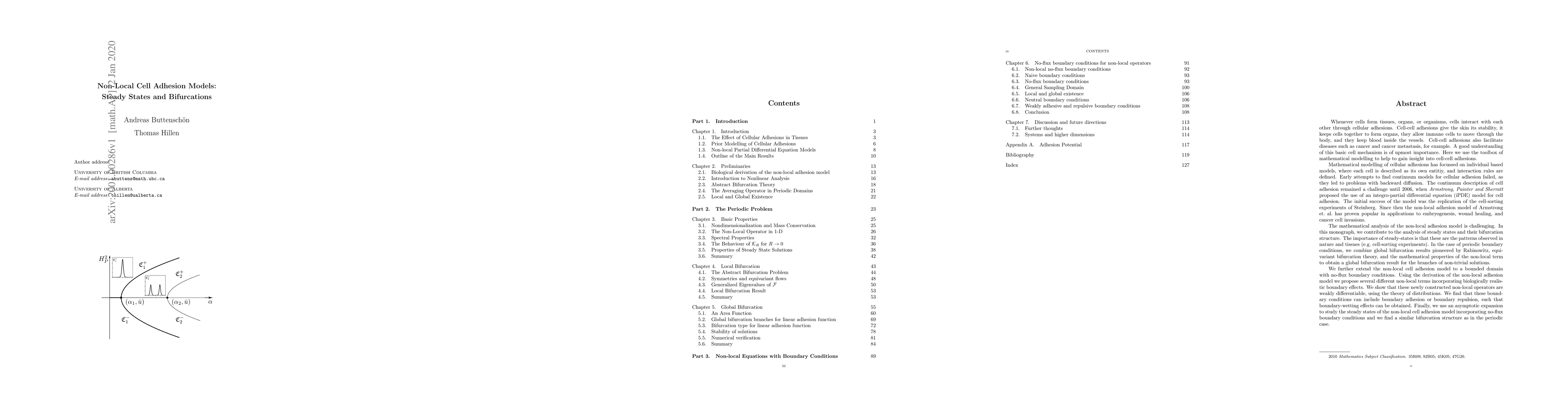 In this manuscript, we consider the modelling of cellular adhesions, which is a key interaction between biological cells. Continuum models of the diffusion-advection-reaction type have long been used in tissue modelling. In 2006, Armstrong, Painter, and Sherratt proposed an extension to take adhesion effects into account. The resulting equation is a non-local advection-diffusion equation. While immensely successful in applications, the development of mathematical theory pertaining to steady states and pattern formation is lacking. The mathematical analysis of the non-local adhesion model is challenging. In this monograph, we contribute to the analysis of steady states and their bifurcation structure. The importance of steady-states is that these are the patterns observed in nature and tissues (e.g. cell-sorting experiments). In the case of periodic boundary conditions, we combine global bifurcation results pioneered by Rabinowitz, equivariant bifurcation theory, and the mathematical properties (maximum principle) of the non-local term to obtain a global bifurcation result for the branches of non-trivial solutions.