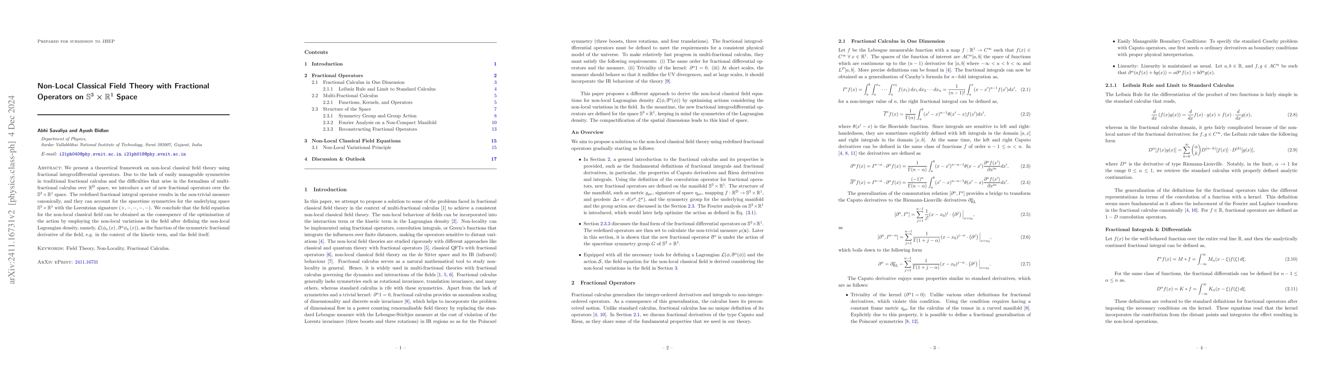This paper develops a non-local classical field theory framework using fractional integrodifferential operators over the $\mathbb{S}^3 \times \mathbb{R}^1$ space. The new fractional operators facilitate spacetime symmetries and optimize the action for non-local field equations.