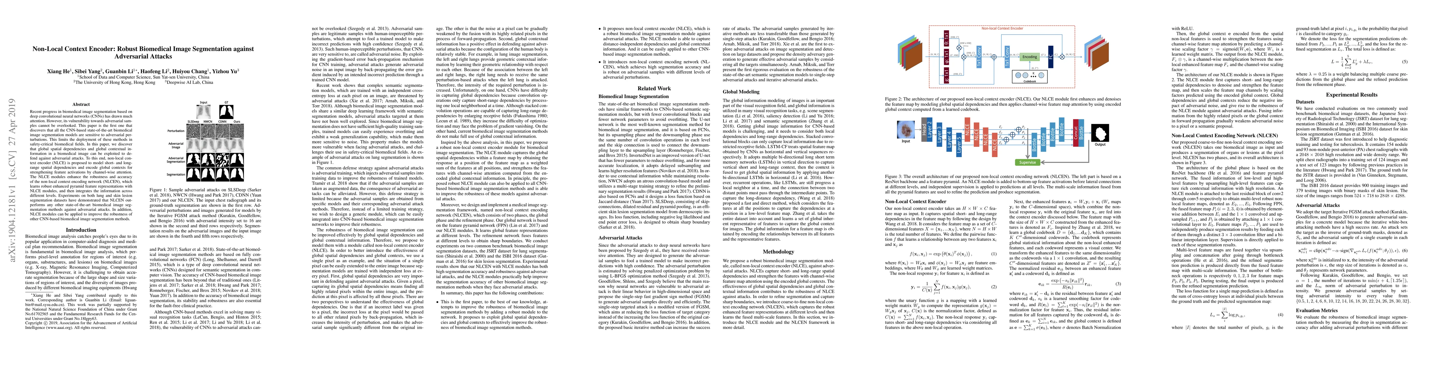 Recent progress in biomedical image segmentation based on deep convolutional neural networks (CNNs) has drawn much attention. However, its vulnerability towards adversarial samples cannot be overlooked. This paper is the first one that discovers that all the CNN-based state-of-the-art biomedical image segmentation models are sensitive to adversarial perturbations. This limits the deployment of these methods in safety-critical biomedical fields. In this paper, we discover that global spatial dependencies and global contextual information in a biomedical image can be exploited to defend against adversarial attacks. To this end, non-local context encoder (NLCE) is proposed to model short- and long range spatial dependencies and encode global contexts for strengthening feature activations by channel-wise attention. The NLCE modules enhance the robustness and accuracy of the non-local context encoding network (NLCEN), which learns robust enhanced pyramid feature representations with NLCE modules, and then integrates the information across different levels. Experiments on both lung and skin lesion segmentation datasets have demonstrated that NLCEN outperforms any other state-of-the-art biomedical image segmentation methods against adversarial attacks. In addition, NLCE modules can be applied to improve the robustness of other CNN-based biomedical image segmentation methods.