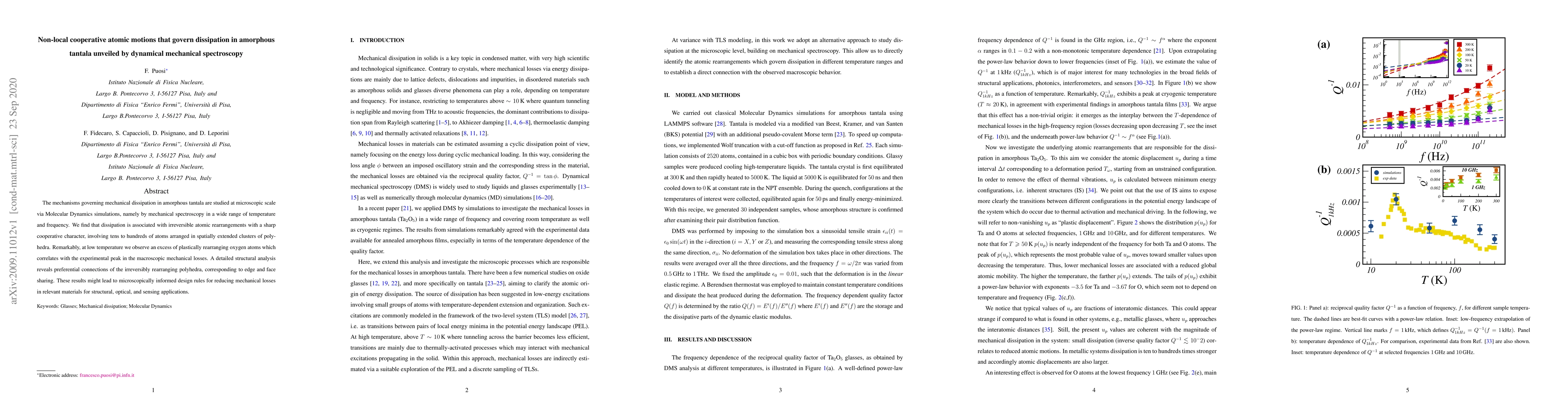 The mechanisms governing mechanical dissipation in amorphous tantala are studied at microscopic scale via Molecular Dynamics simulations, namely by mechanical spectroscopy in a wide range of temperature and frequency. We find that dissipation is associated with irreversible atomic rearrangements with a sharp cooperative character, involving tens to hundreds of atoms arranged in spatially extended clusters of polyhedra. Remarkably, at low temperature we observe an excess of plastically rearranging oxygen atoms which correlates with the experimental peak in the macroscopic mechanical losses. A detailed structural analysis reveals preferential connections of the irreversibly rearranging polyhedra, corresponding to edge and face sharing. These results might lead to microscopically informed design rules for reducing mechanical losses in relevant materials for structural, optical, and sensing applications.