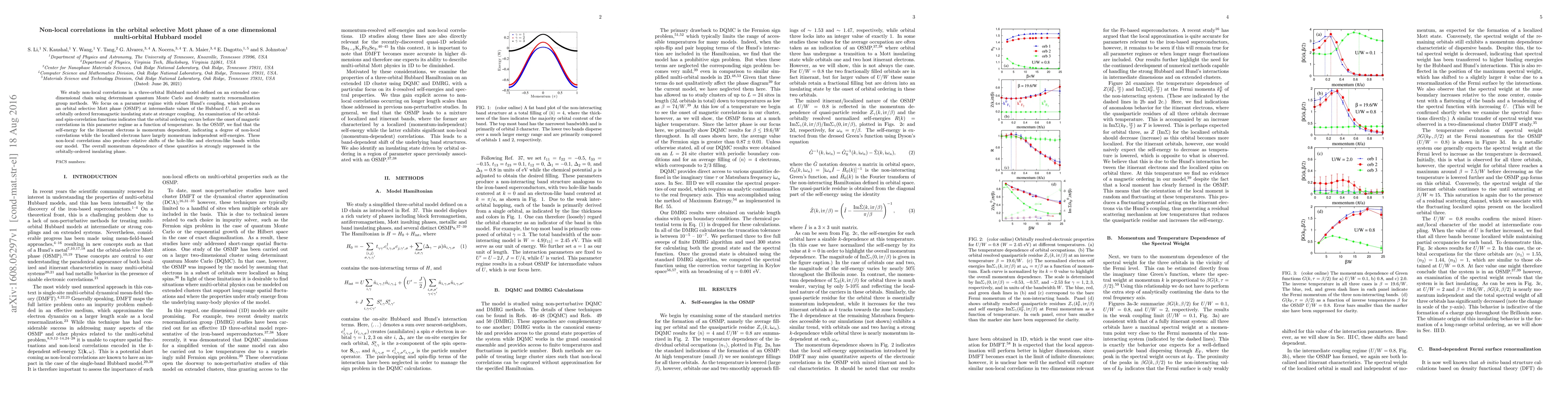 We study non-local correlations in a three-orbital Hubbard model defined on an extended one-dimensional chain using determinant quantum Monte Carlo and density matrix renormalization group methods. We focus on a parameter with robust Hund's coupling, which produces an orbital selective Mott phase (OSMP) at intermediate values of the Hubbard U, as well as an orbitally ordered ferromagnetic insulating state at stronger coupling. An examination of the orbital and spin-correlation functions indicates that the orbital ordering occurs before the onset of magnetic correlations in this parameter regime as a function of temperature. In the OSMP, we find that the self-energy for the itinerant electrons is momentum dependent, indicating a degree of non-local correlations while the localized electrons have largely momentum independent self-energies. These non-local correlations also produce relative shifts of the hole-like and electron-like bands within our model. The overall momentum dependence of these quantities is strongly suppressed in the orbitally-ordered insulating phase.