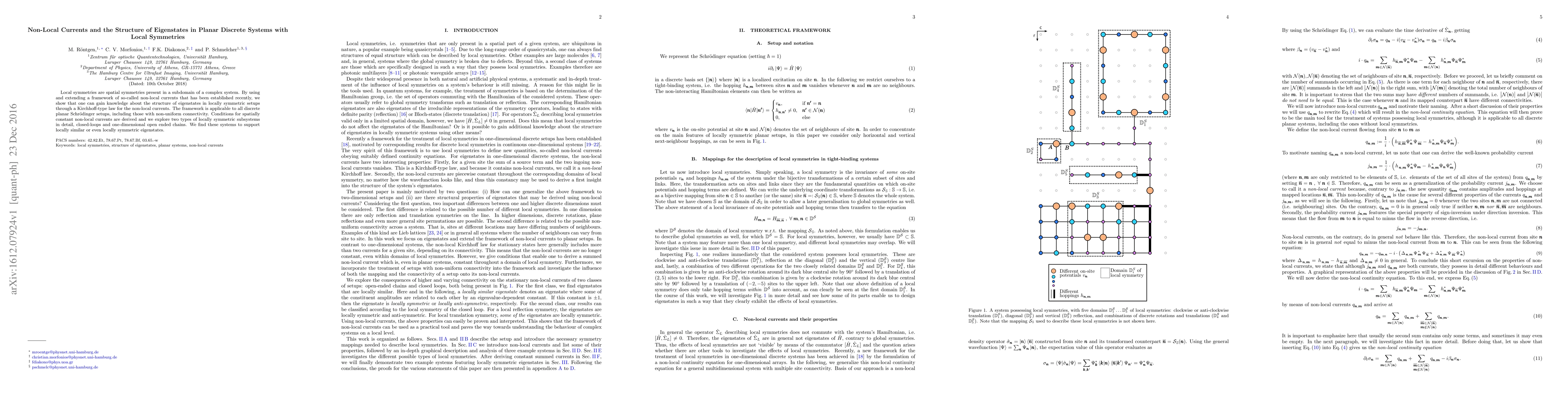 This paper explores the structure of eigenstates in planar discrete systems with local symmetries using non-local currents. It demonstrates that Kirchhoff-type laws for these currents provide insights into the eigenstates, applicable to various discrete planar Schrödinger systems, and identifies conditions for spatially constant non-local currents in closed-loops and open-ended chains.