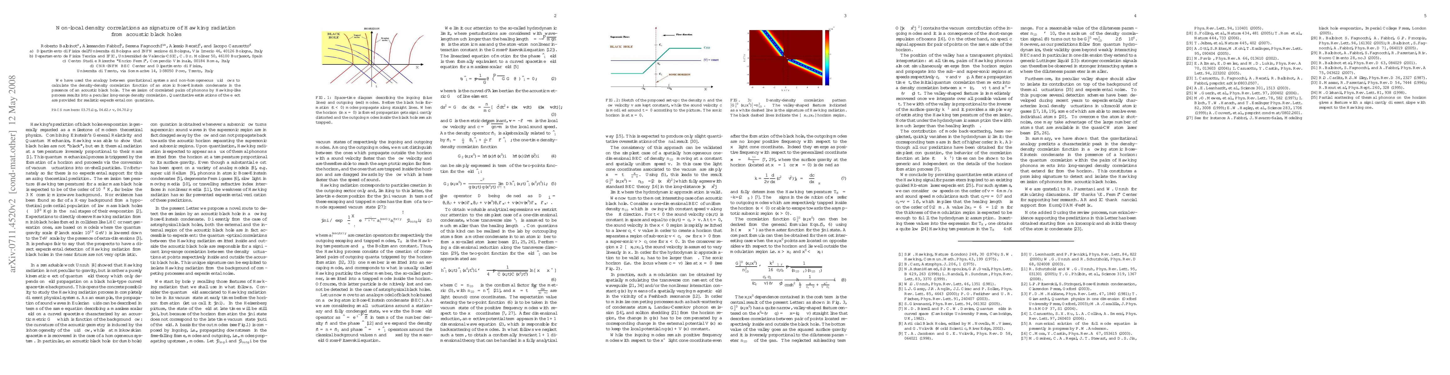 We have used the analogy between gravitational systems and non-homogeneous fluid flows to calculate the density-density correlation function of an atomic Bose-Einstein condensate in the presence of an acoustic black hole. The emission of correlated pairs of phonons by Hawking-like process results into a peculiar long-range density correlation. Quantitative estimations of the effect are provided for realistic experimental configurations.