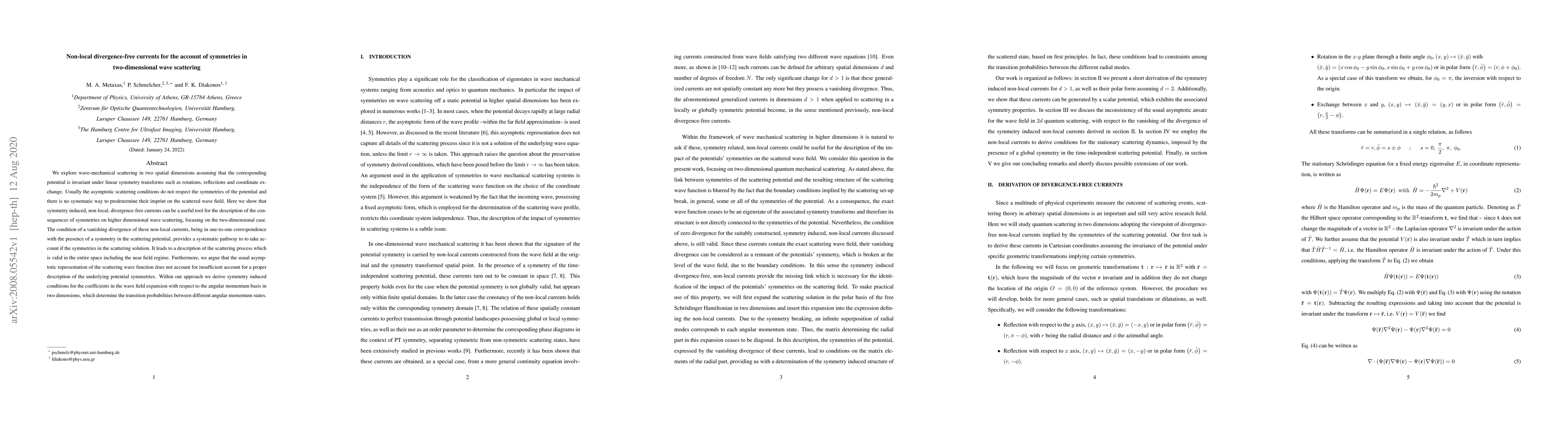 This paper investigates wave scattering in two dimensions under symmetrical potentials, proposing non-local, divergence-free currents as a method to account for symmetry effects. It argues that these currents provide a systematic approach to incorporate symmetry influences in scattering solutions, valid throughout the entire space, and improve upon traditional asymptotic representations.