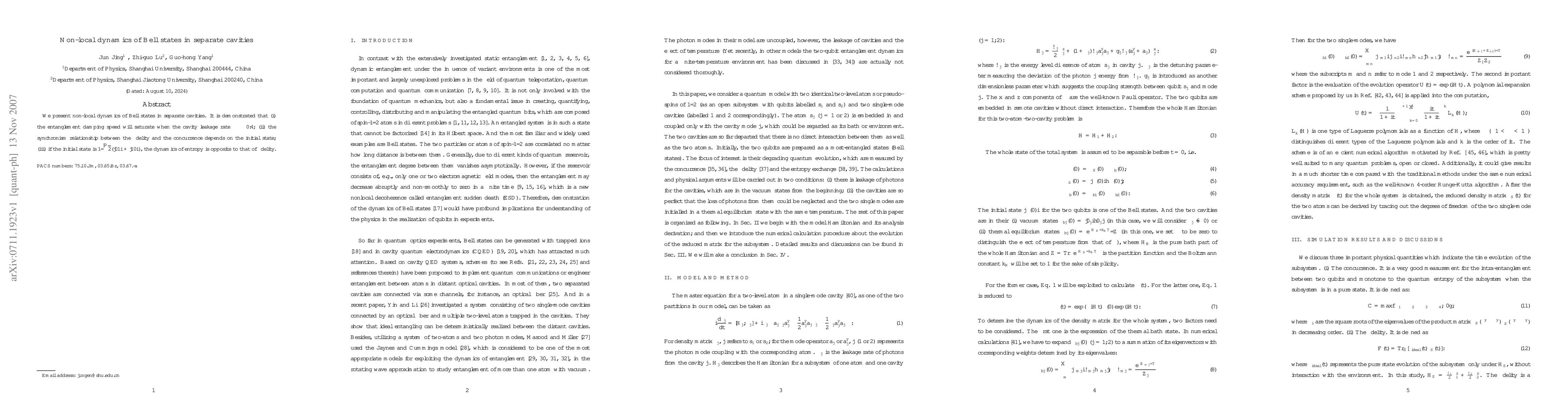 We present non-local dynamics of Bell states in separate cavities. It is demonstrated that (i) the entanglement damping speed will saturate when the cavity leakage rate $\gamma\geq 0.4$; (ii) the synchronism relationship between the fidelity and the concurrence depends on the initial state; (iii) if the initial state is $1/\sqrt{2}(|01>+|10>)$, the dynamics of entropy is opposite to that of fidelity.