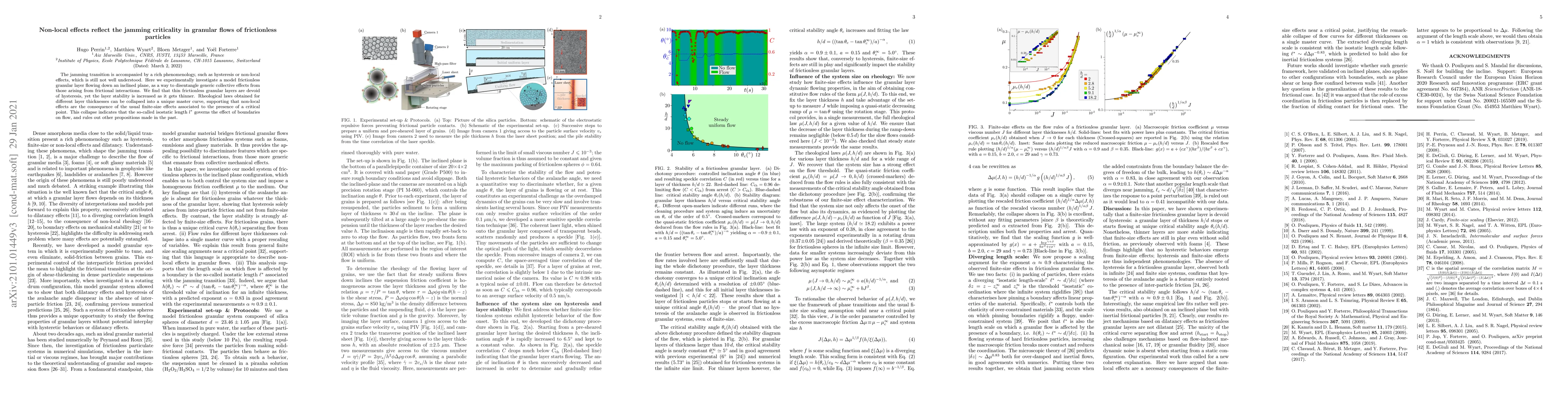This paper experimentally investigates frictionless granular layers flowing down an inclined plane, revealing that non-local effects, such as increased layer stability, are linked to the jamming criticality. The findings suggest that the isostatic length $l^*$ governs boundary effects on flow, collapsing rheological laws into a unique master curve.