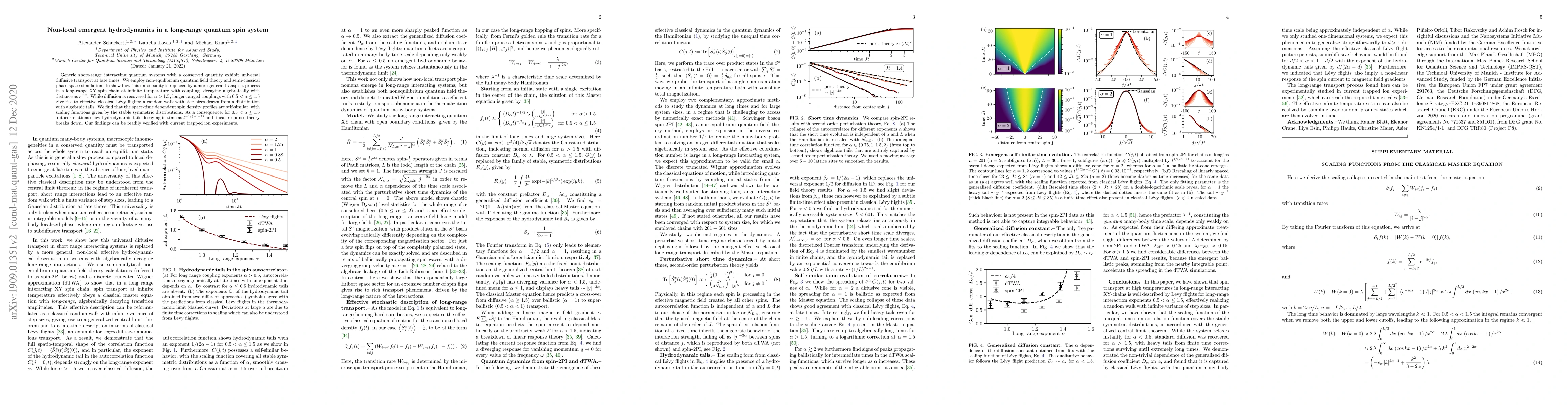 This research demonstrates that long-range quantum spin chains, with couplings decaying algebraically with distance, exhibit non-universal transport. For certain range parameters (0.5<α≤1.5), these systems display Lévy flights instead of diffusion, characterized by hydrodynamic tails with power-law decays. The findings suggest that current trapped ion experiments can verify these effects, challenging conventional understanding of quantum transport.