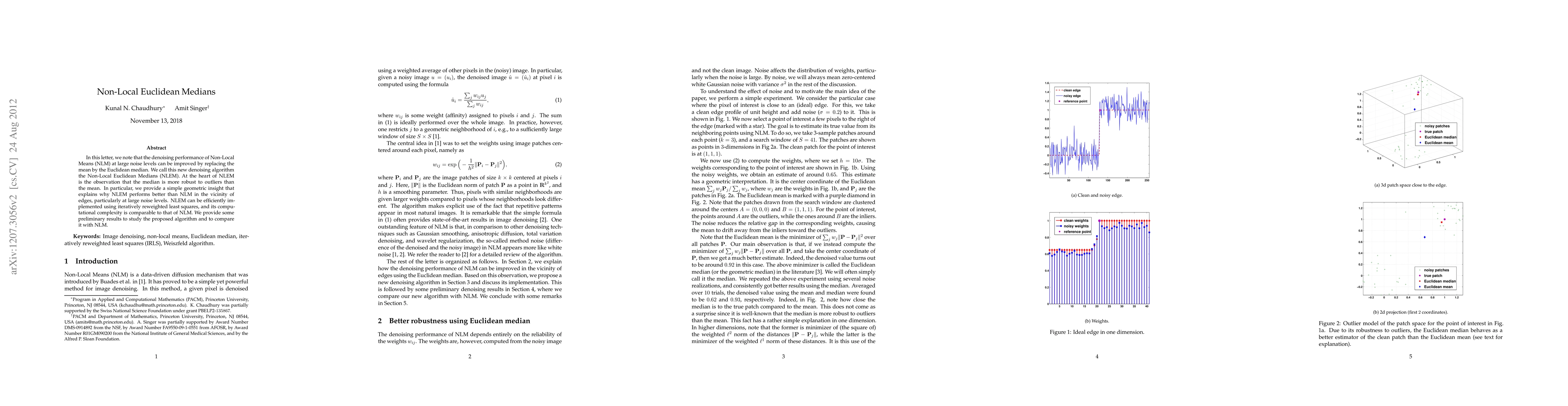The Non-Local Euclidean Medians (NLEM) algorithm improves denoising performance over Non-Local Means (NLM) by replacing the mean with the Euclidean median, leveraging the median's robustness to outliers. Preliminary results show better performance near edges, especially at high noise levels, with comparable computational complexity.