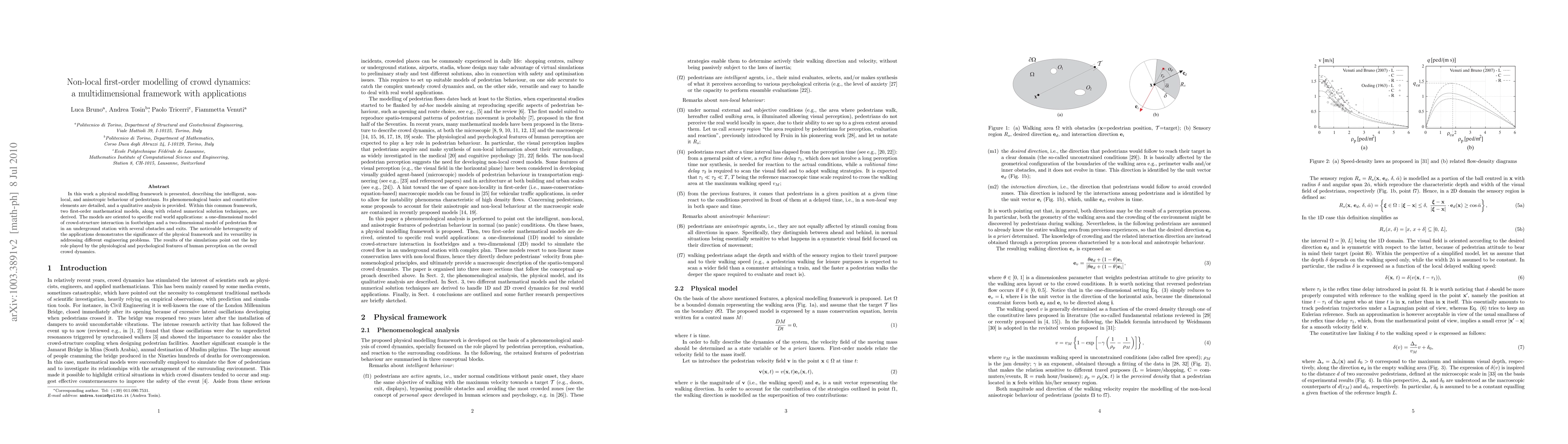 In this work a physical modelling framework is presented, describing the intelligent, non-local, and anisotropic behaviour of pedestrians. Its phenomenological basics and constitutive elements are detailed, and a qualitative analysis is provided. Within this common framework, two first-order mathematical models, along with related numerical solution techniques, are derived. The models are oriented to specific real world applications: a one-dimensional model of crowd-structure interaction in footbridges and a two-dimensional model of pedestrian flow in an underground station with several obstacles and exits. The noticeable heterogeneity of the applications demonstrates the significance of the physical framework and its versatility in addressing different engineering problems. The results of the simulations point out the key role played by the physiological and psychological features of human perception on the overall crowd dynamics.