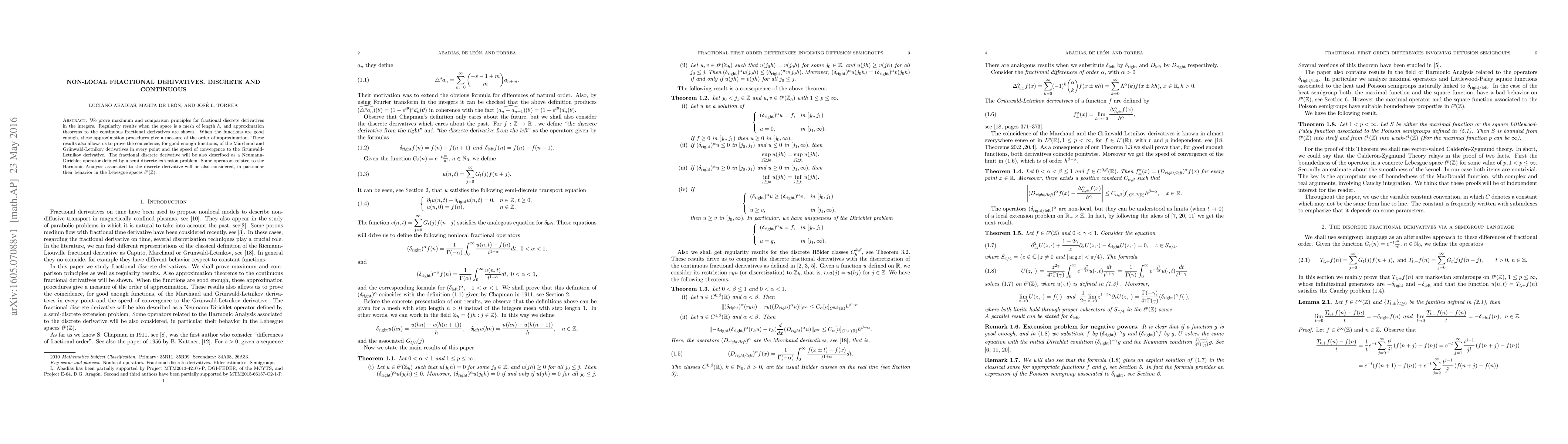 We prove maximum and comparison principles for fractional discrete derivatives in the integers. Regularity results when the space is a mesh of length $h$, and approximation theorems to the continuous fractional derivatives are shown. When the functions are good enough, these approximation procedures give a measure of the order of approximation. These results also allows us to prove the coincidence, for good enough functions, of the Marchaud and Gr\"unwald-Letnikov derivatives in every point and the speed of convergence to the Gr\"unwald-Letnikov derivative. The fractional discrete derivative will be also described as a Neumann-Dirichlet operator defined by a semi-discrete extension problem. Some operators related to the Harmonic Analysis associated to the discrete derivative will be also considered, in particular their behavior in the Lebesgue spaces $\ell^p(\mathbb{Z}).$