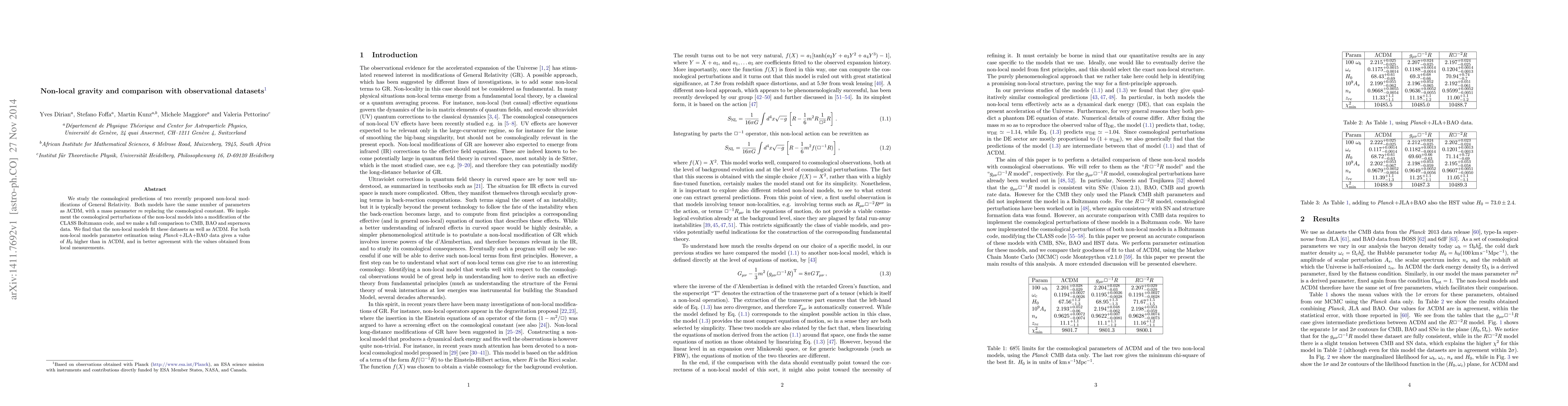 This paper investigates two non-local modifications of General Relativity, comparing their cosmological predictions to observational datasets like CMB, BAO, and supernova data. The non-local models fit the datasets as well as the $\Lambda$CDM model, with a higher Hubble constant $H_0$ that aligns better with local measurements.