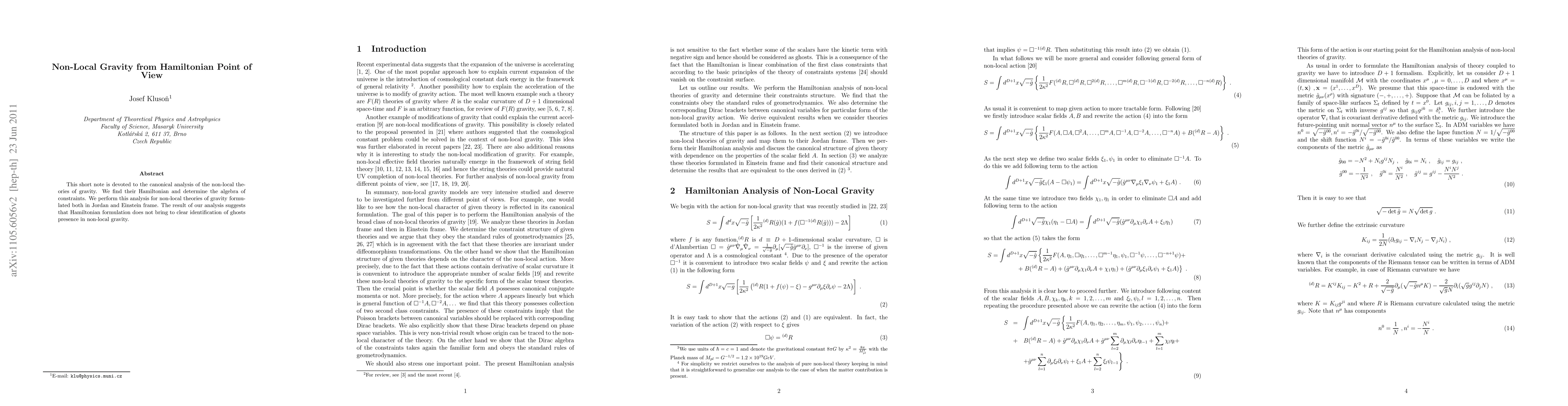 This short note is devoted to the canonical analysis of the non-local theories of gravity. We find their Hamiltonian and determine the algebra of constraints. We perform this analysis for non-local theories of gravity formulated both in Jordan and Einstein frame. The result of our analysis suggests that Hamiltonian formulation does not bring to clear identification of ghosts presence in non-local gravity.