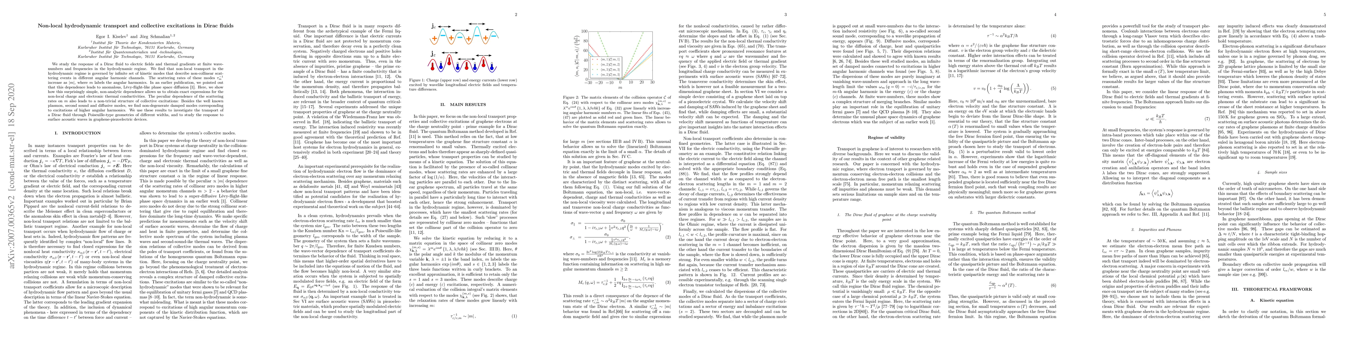 We study the response of a Dirac fluid to electric fields and thermal gradients at finite wave-numbers and frequencies in the hydrodynamic regime. We find that non-local transport in the hydrodynamic regime is governed by infinite set of kinetic modes that describe non-collinear scattering events in different angular harmonic channels. The scattering rates of these modes $\tau_{m}^{-1}$ increase as $\|m\|$, where $m$ labels the angular harmonics. In an earlier publication, we pointed out that this dependence leads to anomalous, L\'evy-flight-like phase space diffusion (Phys. Rev. Lett. 123, 195302 (2019)). Here, we show how this surprisingly simple, non-analytic dependence allows us to obtain exact expressions for the non-local charge and electronic thermal conductivities. The peculiar dependence of the scattering rates on $m$ also leads to a non-trivial structure of collective excitations: Besides the well known plasmon, second sound and diffusive modes, we find non-degenerate damped modes corresponding to excitations of higher angular harmonics. We use these results to investigate the transport of a Dirac fluid through Poiseuille-type geometries of different widths, and to study the response to surface acoustic waves in graphene-piezoelectric devices.