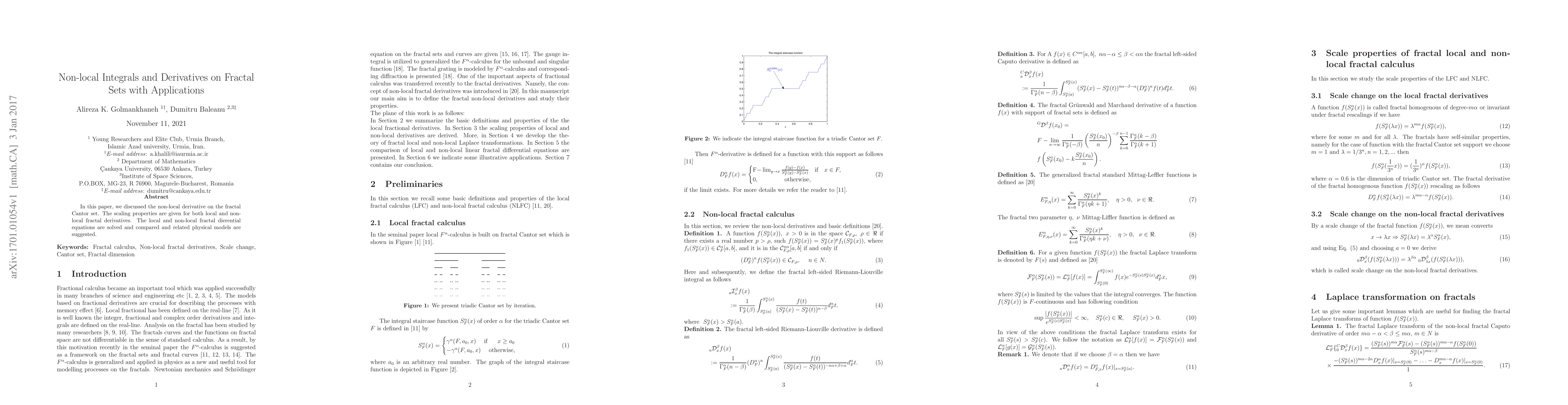 This paper explores non-local derivatives on the fractal Cantor set, comparing local and non-local fractal derivatives through their scaling properties. It solves associated differential equations and proposes related physical models.