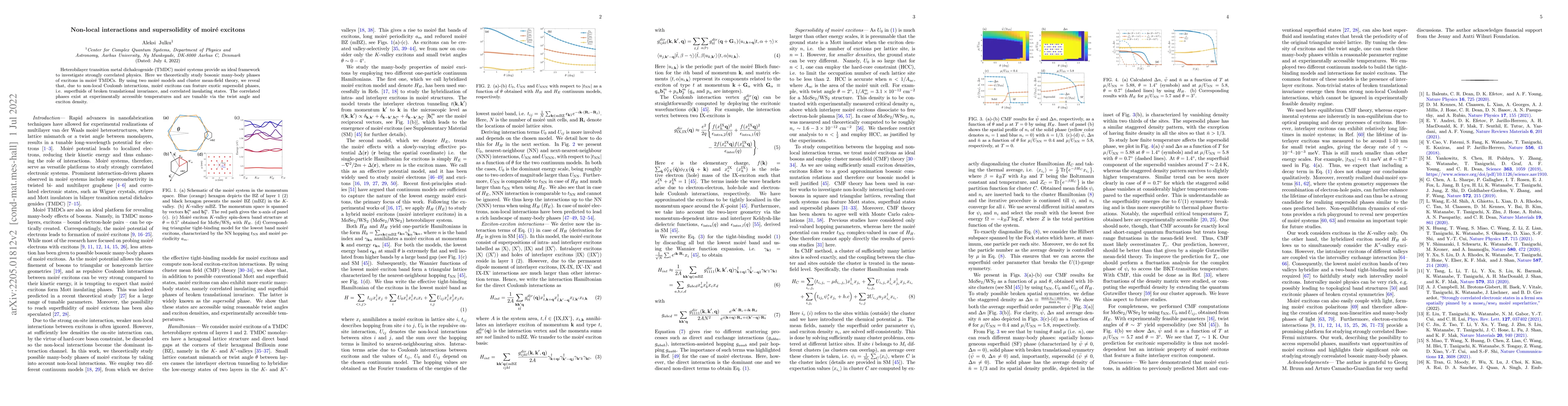 This research theoretically investigates exciton behavior in moiré TMDC systems, demonstrating that non-local Coulomb interactions can lead to supersolid phases and correlated insulating states, which are experimentally accessible and tunable.