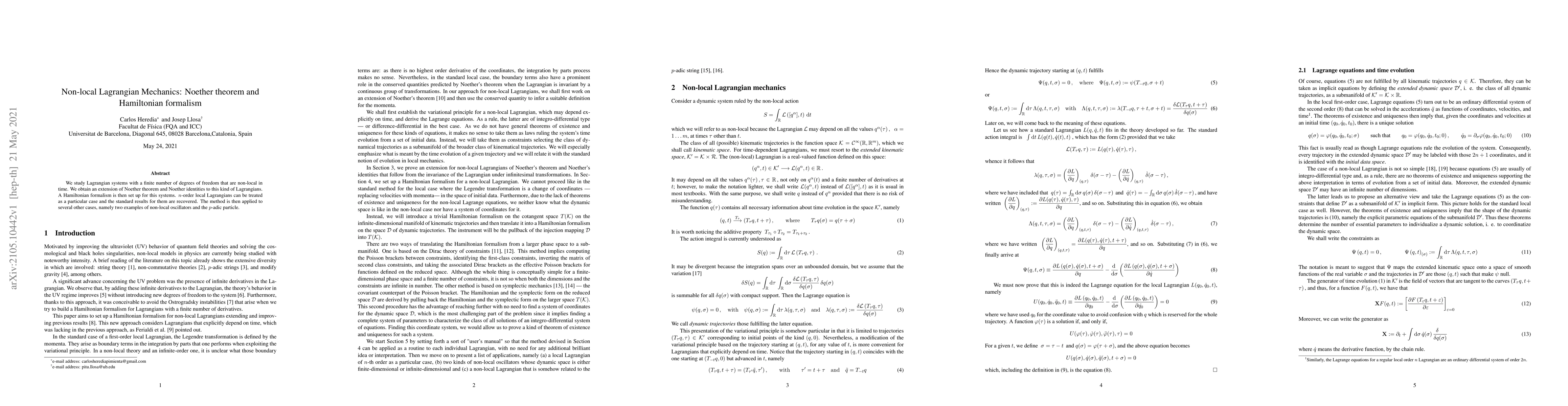 This paper extends Noether's theorem and Hamiltonian formalism to non-local Lagrangian mechanics, treating $n$-order local Lagrangians as a special case. It applies the method to non-local oscillators and the p-adic particle, demonstrating its broader applicability.