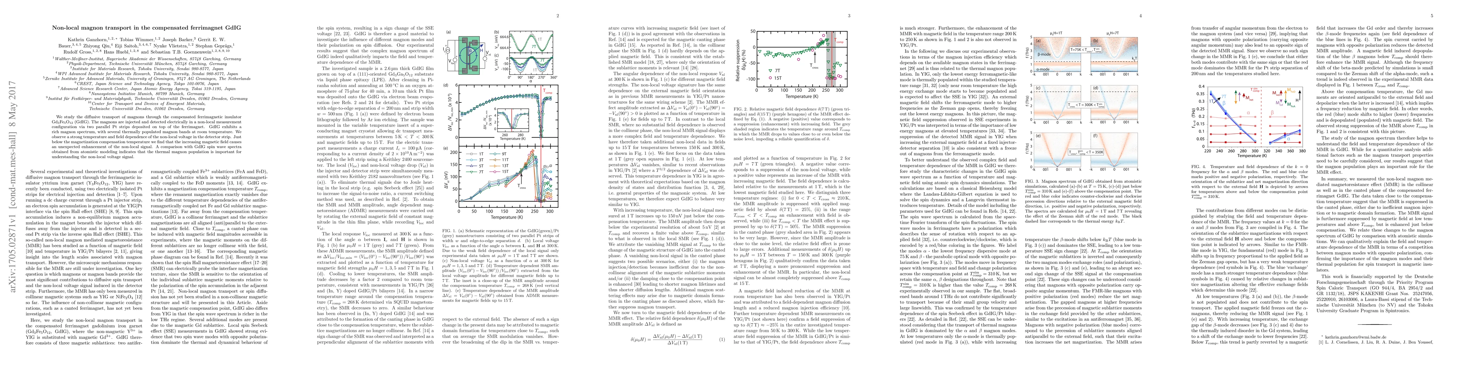 We study the diffusive transport of magnons through the compensated ferrimagnetic insulator Gd3Fe5O12 (GdIG). The magnons are injected and detected electrically in a non-local measurement configuration via two parallel Pt strips deposited on top of the ferrimagnet. GdIG exhibits a rich magnon spectrum, with several thermally populated magnon bands at room temperature. We observe a strong temperature and field dependence of the non-local voltage in the detector strip. Just below the magnetization compensation temperature we find that the increasing magnetic field causes an unexpected enhancement of the non-local signal. A comparison with GdIG spin wave spectra obtained from atomistic modeling indicates that the thermal magnon population is important for understanding the non-local voltage signal.