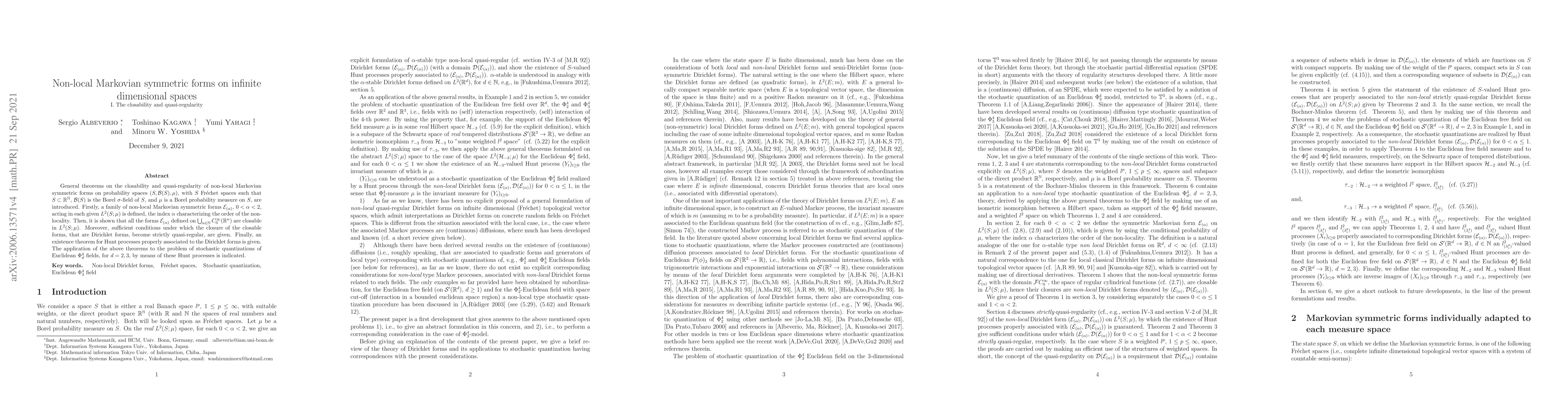 General theorems on the closability and quasi-regularity of non-local Markovian symmetric forms on probability spaces $(S, {\cal B}(S), \mu)$, with $S$ Fr{\'e}chet spaces such that $S \subset {\mathbb R}^{\mathbb N}$, ${\cal B}(S)$ is the Borel $\sigma$-field of $S$, and $\mu$ is a Borel probability measure on $S$, are introduced. Firstly, a family of non-local Markovian symmetric forms ${\cal E}_{(\alpha)}$, $0 < \alpha < 2$, acting in each given $L^2(S; \mu)$ is defined, the index $\alpha$ characterizing the order of the non-locality. Then, it is shown that all the forms ${\cal E}_{(\alpha)}$ defined on $\bigcup_{n \in {\mathbb N}} C^{\infty}_0({\mathbb R}^n)$ are closable in $L^2(S;\mu)$. Moreover, sufficient conditions under which the closure of the closable forms, that are Dirichlet forms, become strictly quasi-regular, are given. Finally, an existence theorem for Hunt processes properly associated to the Dirichlet forms is given. The application of the above theorems to the problem of stochastic quantizations of Euclidean $\Phi^4_d$ fields, for $d =2, 3$, by means of these Hunt processes is indicated.