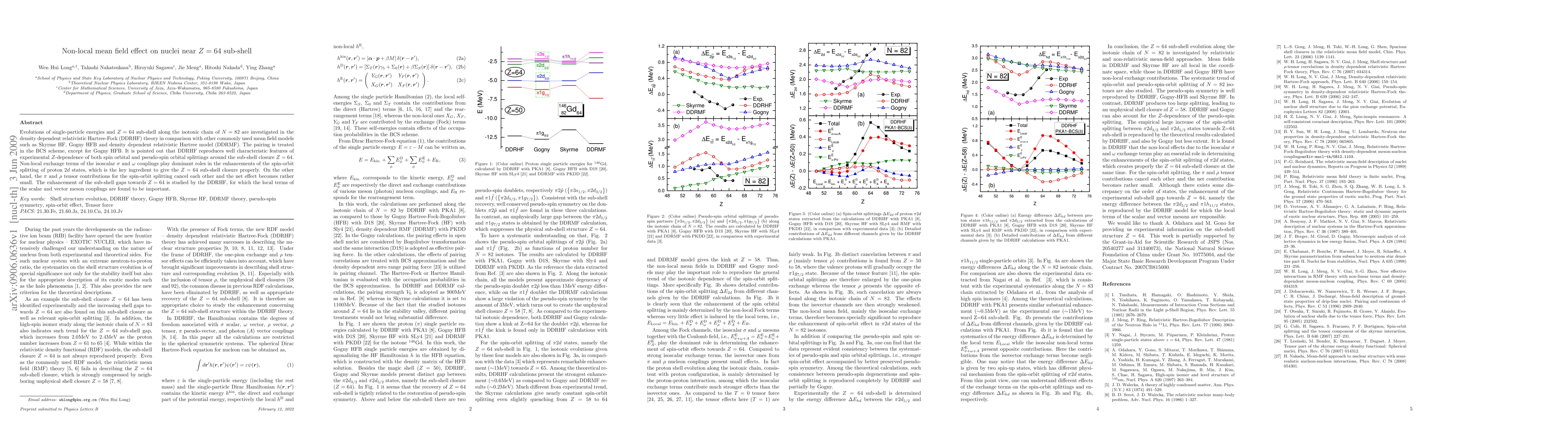 Evolutions of single-particle energies and Z=64 sub-shell along the isotonic chain of N=82 are investigated in the density dependent relativistic Hartree-Fock (DDRHF) theory in comparison with other commonly used mean field models such as Skyrme HF, Gogny HFB and density dependent relativistic Hartree model (DDRMF). The pairing is treated in the BCS scheme, except for Gogny HFB. It is pointed out that DDRHF reproduces well characteristic features of experimental $Z$-dependence of both spin orbital and pseudo-spin orbital splittings around the sub-shell closure Z=64. Non-local exchange terms of the isoscalar $\sigma$ and $\omega$ couplings play dominant roles in the enhancements of the spin-orbit splitting of proton 2d states, which is the key ingredient to give the Z=64 sub-shell closure properly. On the other hand, the $\pi$ and $\rho$ tensor contributions for the spin-orbit splitting cancel each other and the net effect becomes rather small. The enhancement of the sub-shell gaps towards Z=64 is studied by the DDRHF, for which the local terms of the scalar and vector meson couplings are found to be important.