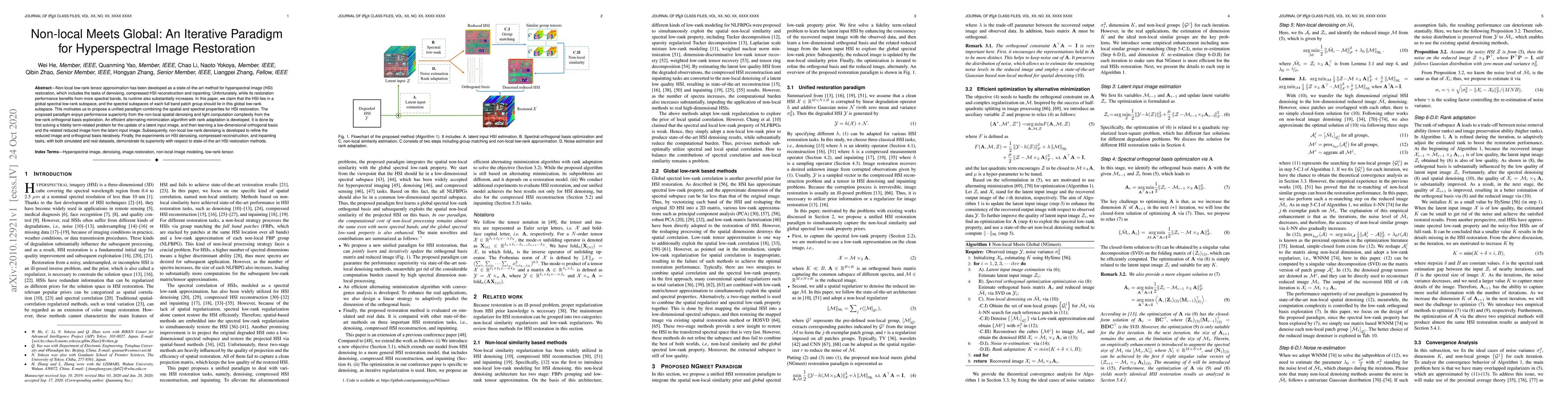 This paper proposes a unified paradigm for hyperspectral image restoration that combines spatial and spectral properties, leveraging non-local low-rank tensor approximation and low-rank orthogonal basis exploration to achieve superior performance while maintaining computational efficiency. The iterative algorithm demonstrates superior results in denoising, compressed reconstruction, and inpainting tasks compared to state-of-the-art methods.