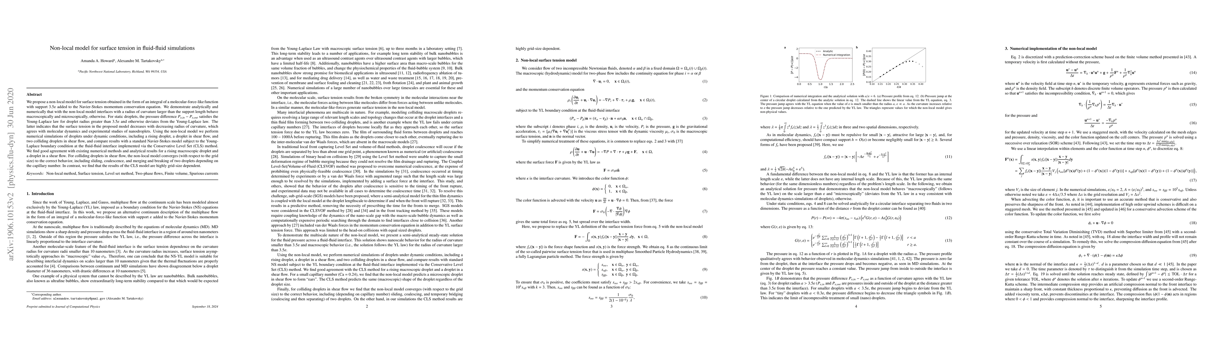 We propose a non-local model for surface tension obtained in the form of an integral of a molecular-force-like function with support $3.5\varepsilon$ added to the Navier-Stokes momentum conservation equation. We demonstrate analytically and numerically that with the non-local model interfaces with a radius of curvature larger than the support length behave macroscopically and microscopically, otherwise. For static droplets, the pressure difference $P_{\varepsilon, in} - P_{\varepsilon, out}$ satisfies the Young-Laplace law for droplet radius greater than $3.5\varepsilon$ and otherwise deviates from the Young-Laplace law. The latter indicates that the surface tension in the proposed model decreases with decreasing radius of curvature, which agrees with molecular dynamics and experimental studies of nanodroplets. Using the non-local model we perform numerical simulations of droplets under dynamic conditions, including a rising droplet, a droplet in shear flow, and two colliding droplets in shear flow, and compare results with a standard Navier-Stokes model subject to the Young-Laplace boundary condition at the fluid-fluid interface implemented via the Conservative Level Set (CLS) method. We find good agreement with existing numerical methods and analytical results for a rising macroscopic droplet and a droplet in a shear flow. For colliding droplets in shear flow, the non-local model converges (with respect to the grid size) to the correct behavior, including sliding, coalescence, and merging and breaking of two droplets depending on the capillary number. In contrast, we find that the results of the CLS model are highly grid-size dependent.