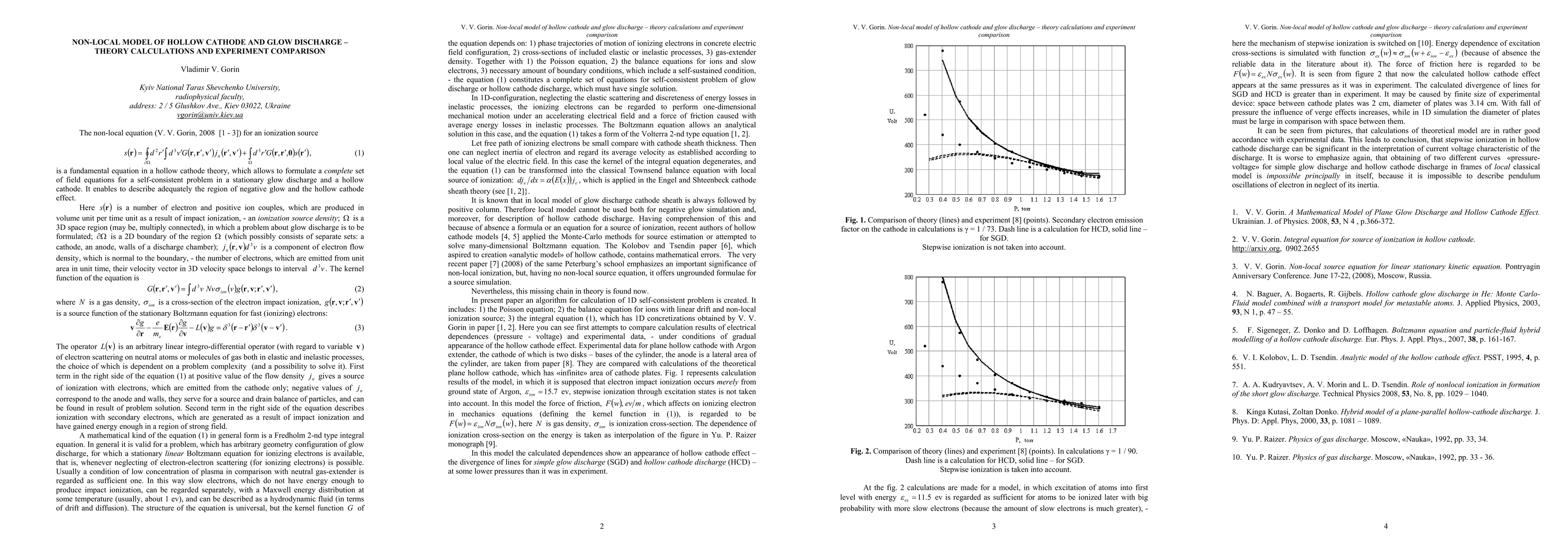 This paper formulates a non-local equation for ionization sources in glow discharge and hollow cathodes, enabling a complete set of field equations for self-consistent analysis. Initial comparisons between theoretical calculations and experimental data on pressure-voltage dependencies under hollow cathode effect conditions are presented.