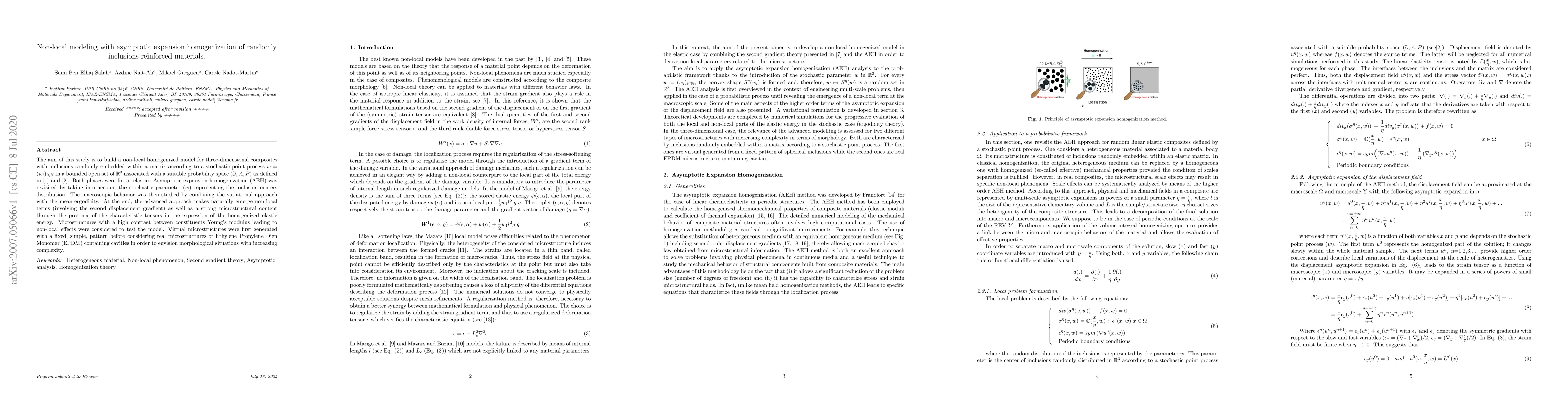 Researchers developed a non-local homogenized model for three-dimensional composites with inclusions embedded randomly within a matrix, using asymptotic expansion homogenization to capture macroscopic behavior.