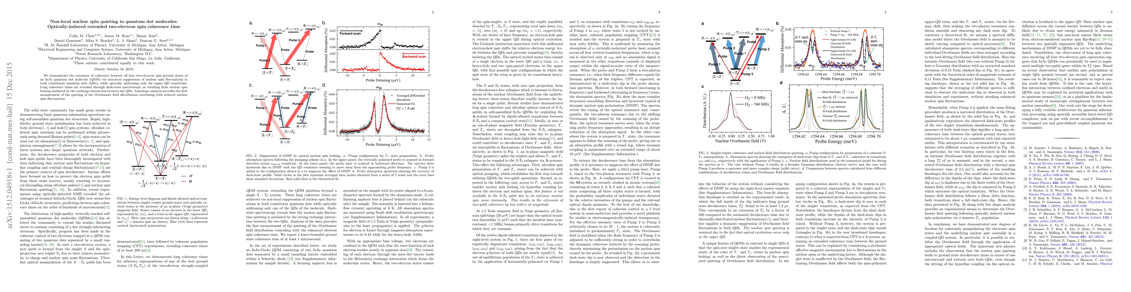 This paper demonstrates the extension of coherence times for two-electron spin states in an InAs quantum dot molecule via non-local nuclear spin quieting, achieved by optically addressing only the upper quantum dot. This results in long coherence times through nuclear spin locking mediated by the exchange interaction.