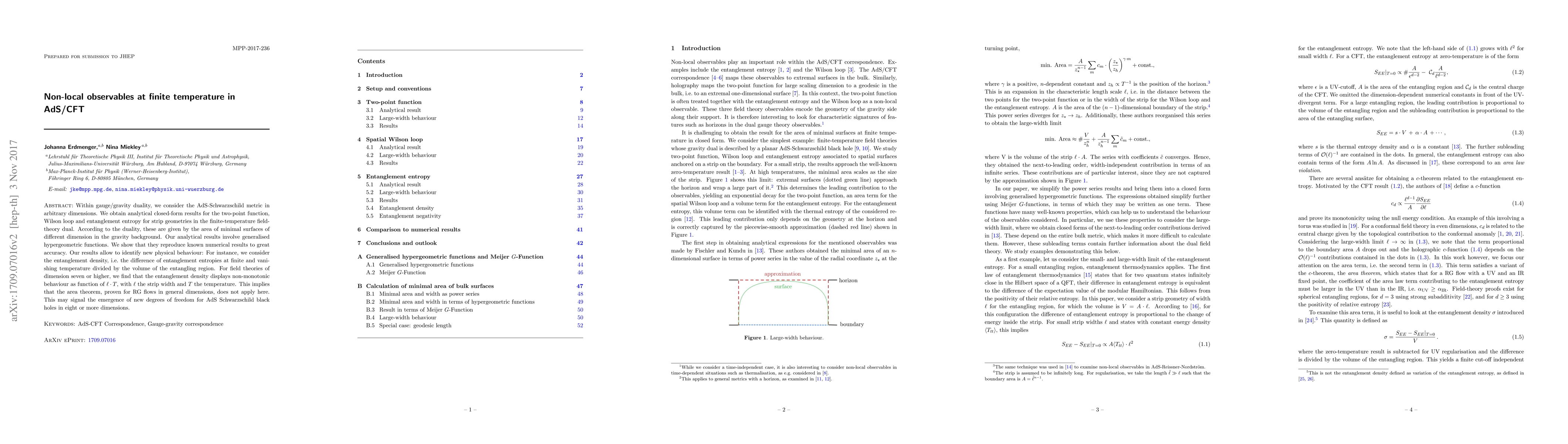 Within gauge/gravity duality, we consider the AdS-Schwarzschild metric in arbitrary dimensions. We obtain analytical closed-form results for the two-point function, Wilson loop and entanglement entropy for strip geometries in the finite-temperature field-theory dual. According to the duality, these are given by the area of minimal surfaces of different dimension in the gravity background. Our analytical results involve generalised hypergeometric functions. We show that they reproduce known numerical results to great accuracy. Our results allow to identify new physical behaviour: For instance, we consider the entanglement density, i.e. the difference of entanglement entropies at finite and vanishing temperature divided by the volume of the entangling region. For field theories of dimension seven or higher, we find that the entanglement density displays non-monotonic behaviour as function of l*T, with l the strip width and T the temperature. This implies that the area theorem, proven for RG flows in general dimensions, does not apply here. This may signal the emergence of new degrees of freedom for AdS Schwarzschild black holes in eight or more dimensions.