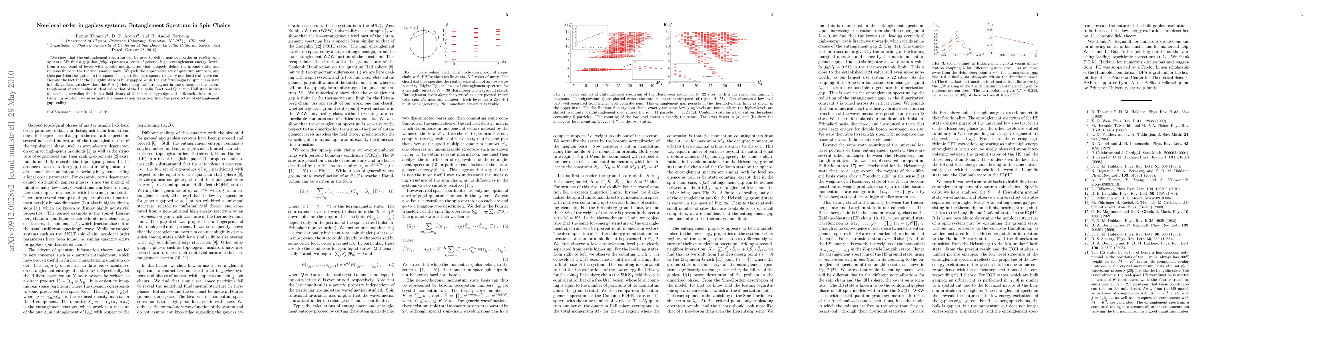 We show that the entanglement spectrum can be used to define non-local order in gapless spin systems. We find a gap that fully separates a series of generic, high `entanglement energy' levels, from a flat band of levels with specific multiplicities that uniquely define the ground-state, and remains finite in the thermodynamic limit. We pick the appropriate set of quantum numbers, and then partition the system in this space. This partition corresponds to a very non-local real-space cut. Despite the fact that the Laughlin state is bulk gapped while the antiferromagnetic spin chain state is bulk gapless, we show that the S=1/2 Heisenberg antiferromagnet in one dimension has an entanglement spectrum almost identical to that of the Laughlin Fractional Quantum Hall state in two dimensions, revealing the similar field theory of their low-energy edge and bulk excitations respectively.