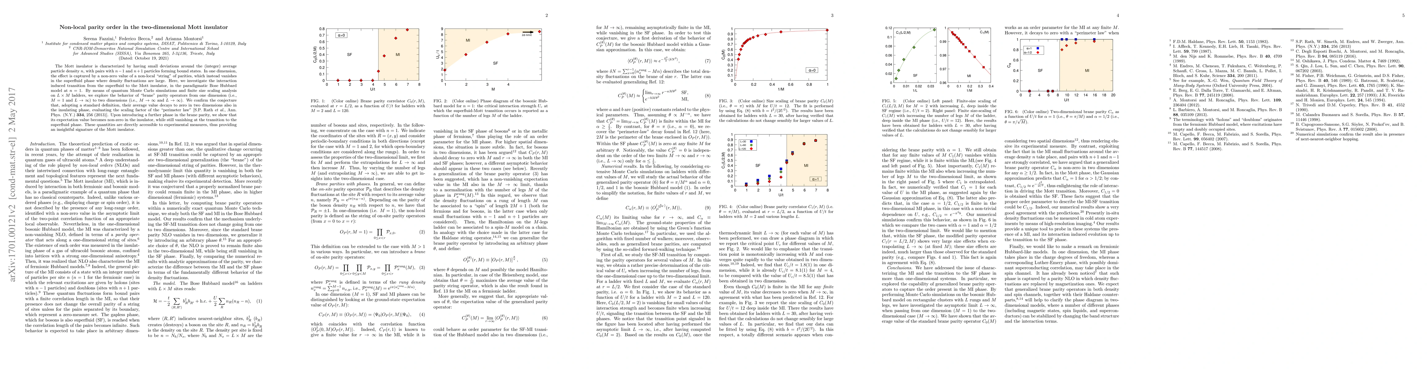 The Mott insulator is characterized by having small deviations around the (integer) average particle density n, with pairs with n-1 and n+1 particles forming bound states. In one dimension, the effect is captured by a non-zero value of a non-local "string" of parities, which instead vanishes in the superfluid phase where density fluctuations are large. Here, we investigate the interaction induced transition from the superfluid to the Mott insulator, in the paradigmatic Bose Hubbard model at n=1. By means of quantum Monte Carlo simulations and finite size scaling analysis on LxM ladders, we explore the behavior of "brane" parity operators for L going to infinity from one dimension (i.e., M=1) to two dimensions (i.e., M going to infinity). We confirm the conjecture that, adopting a standard definition, their average value decays to zero in two dimensions also in the insulating phase, evaluating the scaling factor of the "perimeter law" [S.P. Rath et al., Ann. Phys. (N.Y.) 334, 256 (2013)]. Upon introducing a further phase in the brane parity, we show that its expectation value becomes non-zero in the insulator, while still vanishing at the transition to the superfluid phase. These quantities are directly accessible to experimental measures, thus providing an insightful signature of the Mott insulator.