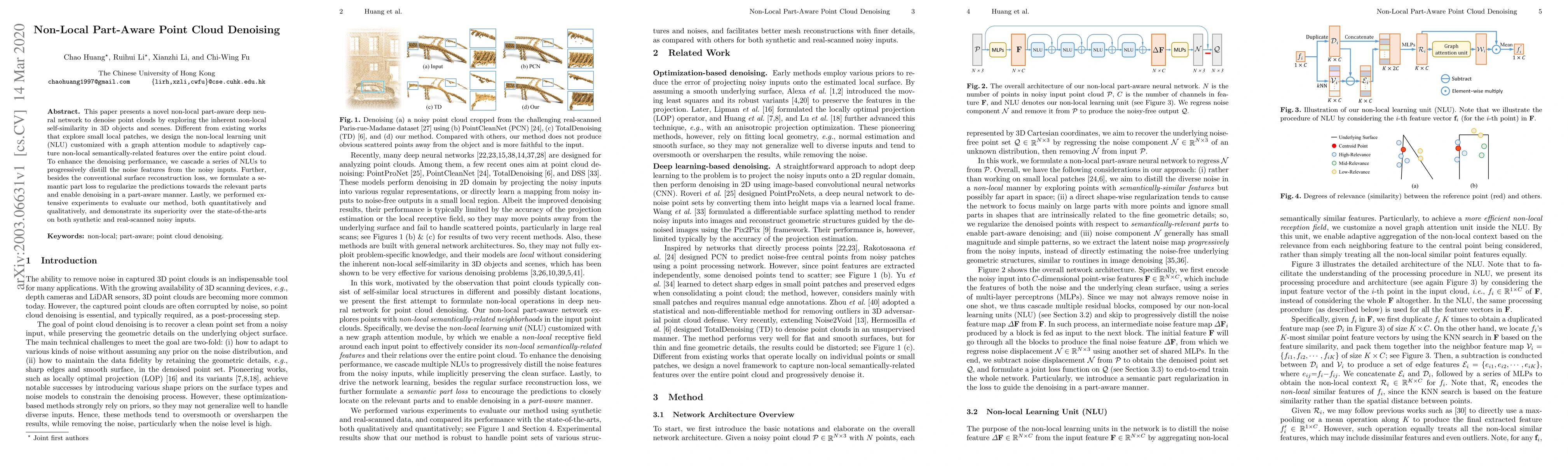 This paper introduces a non-local part-aware deep neural network for point cloud denoising, utilizing a non-local learning unit with a graph attention module to capture global features. The method employs a cascaded structure to progressively remove noise and includes a semantic part loss for part-aware denoising, outperforming existing methods in both synthetic and real datasets.