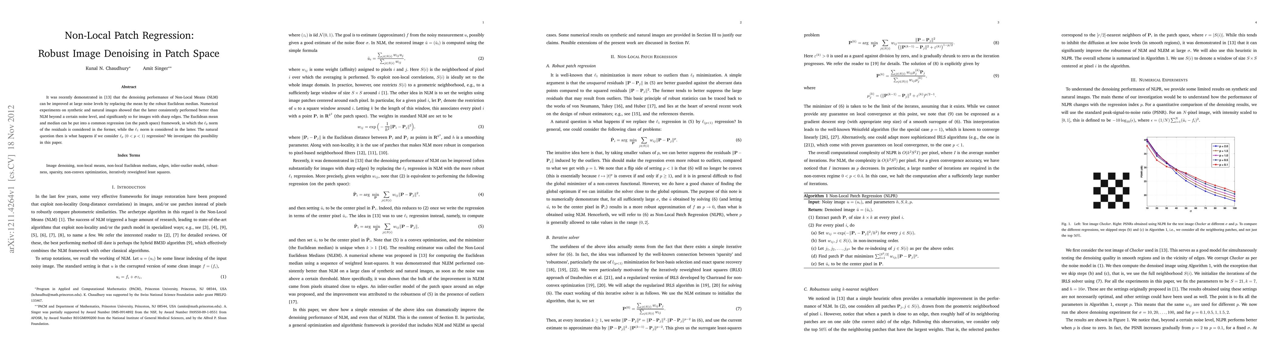 This paper investigates using l_p (0<p<1) regression in patch space for image denoising, improving upon the original Non-Local Means method with robust Euclidean median. The results show that l_1 regression outperforms both methods, especially for images with sharp edges.
